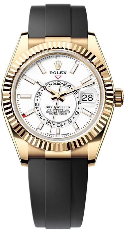 Часы Rolex Sky-Dweller являются официально сертифицированным хронометром COSC, выпущены в круглом корпусе из желтого золота 18к. Размер составляет 42 мм, водонепроницаемость 100 м. Внутри корпуса установлен автоматический механизм, Калибр 9002, обладающий запасом хода 72 часа. На белом циферблате отображаются часы, минуты, секунды, дата, месяц. Годовой календарь. Вращающийся безель. Часы комплектуются каучуковым ремешком с золотой затежкой.
