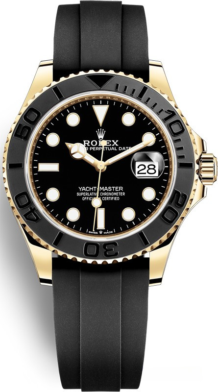 Часы Rolex Yacht-Master 42mm Yellow Gold представлены в корпусе из желтого золота 18к диаметром 42 мм и водонепроницаемостью 100 метров. Внутри корпуса с вращающимся безелем установлен автоматический механизм, Калибр 3235, обладающий запасом хода 70 часов. Механизм сертифицирован в качестве хронометра. На черном циферблате отобрадаются часы, минуты, секунды и дата. Модель поставляется на каучуковом ремешке с золотой застежкой.