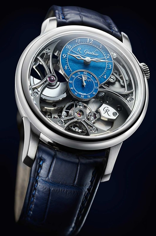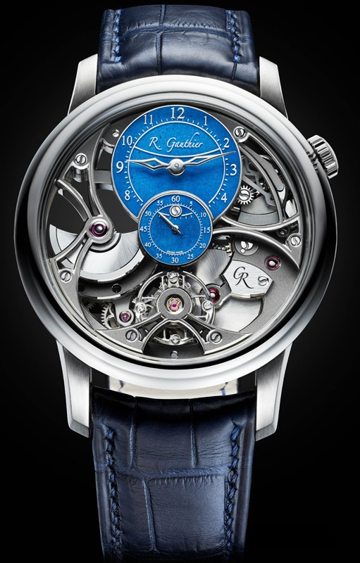 Часы Romain Gauthier Insight Micro-Rotor Squelette представлены в корпусе из платины 950 размером 39.5 мм водонепроницаемостью 50 метров. Внутри корпуса установлен автоматический механизм, обладающий запасом хода 80 часов. На синем циферблате отображаются часы, минуты, секунды. Часы поставляются на ремешке из кожи аллигатора с платиновой вставкой.