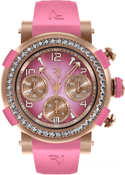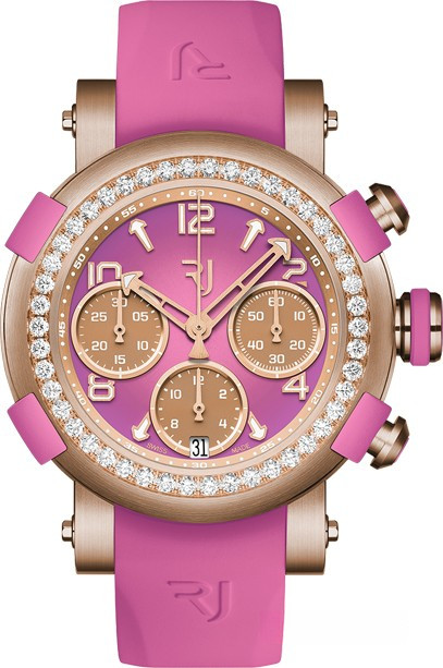 Часы Romain Jerome Arraw Chronograph 42 mm представлены в корпусе из розового золота 18к диаметром 42 мм, водонепроницаемость до 100 метров. Внутри корпуса установлен автоматический механизм, Калибр RJ2041. На розовом циферблате отображаются часы, минуты, секунды, дата, накопители хронографа. Часы комплектуются каучуковым ремешком с вставкой из титана. Безель из 46-ти белых бриллиантов общим весом 1.59 ct.