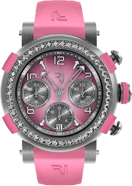 Часы Romain Jerome Arraw Chronograph 42 mm представлены в корпусе из титана диаметром 42 мм, водонепроницаемость до 100 метров. Внутри корпуса установлен автоматический механизм, Калибр RJ2041. На розовом циферблате отображаются часы, минуты, секунды, дата, накопители хронографа. Часы комплектуются каучуковым ремешком с вставкой из титана. Безель из 46-ти белых бриллиантов общим весом 1.59 ct.
