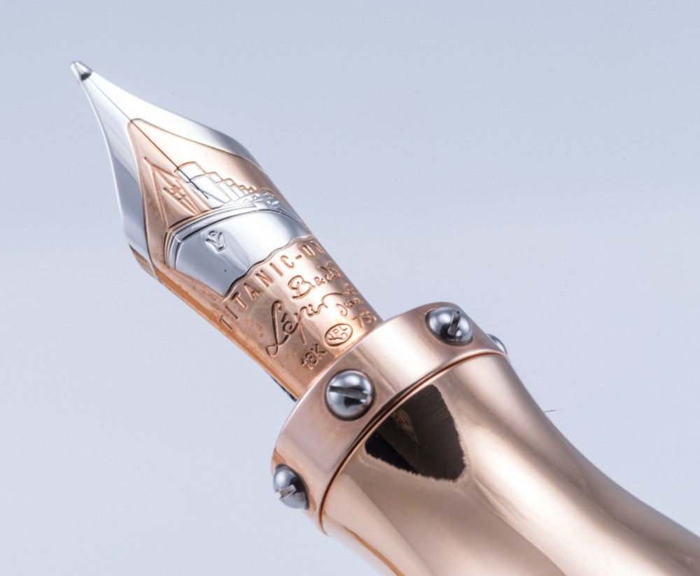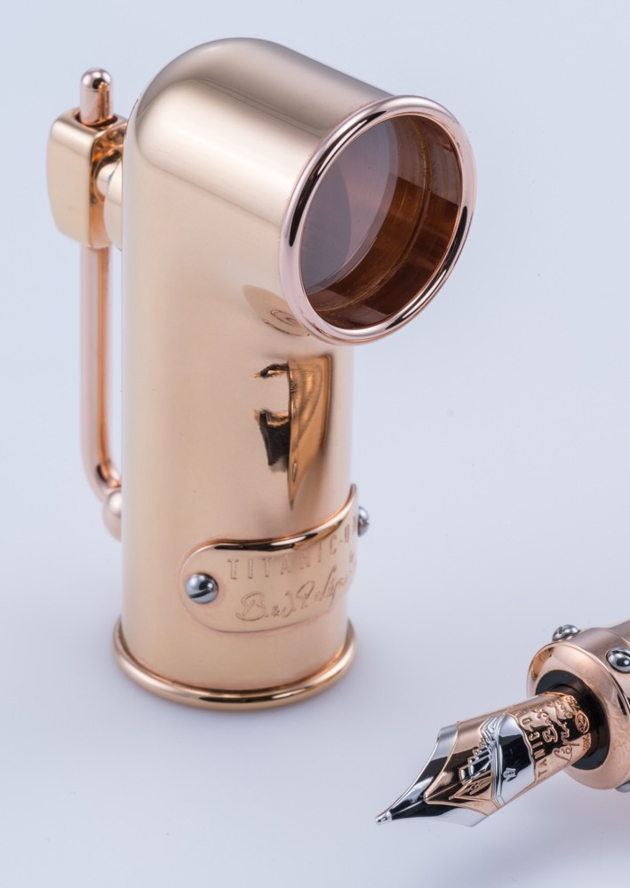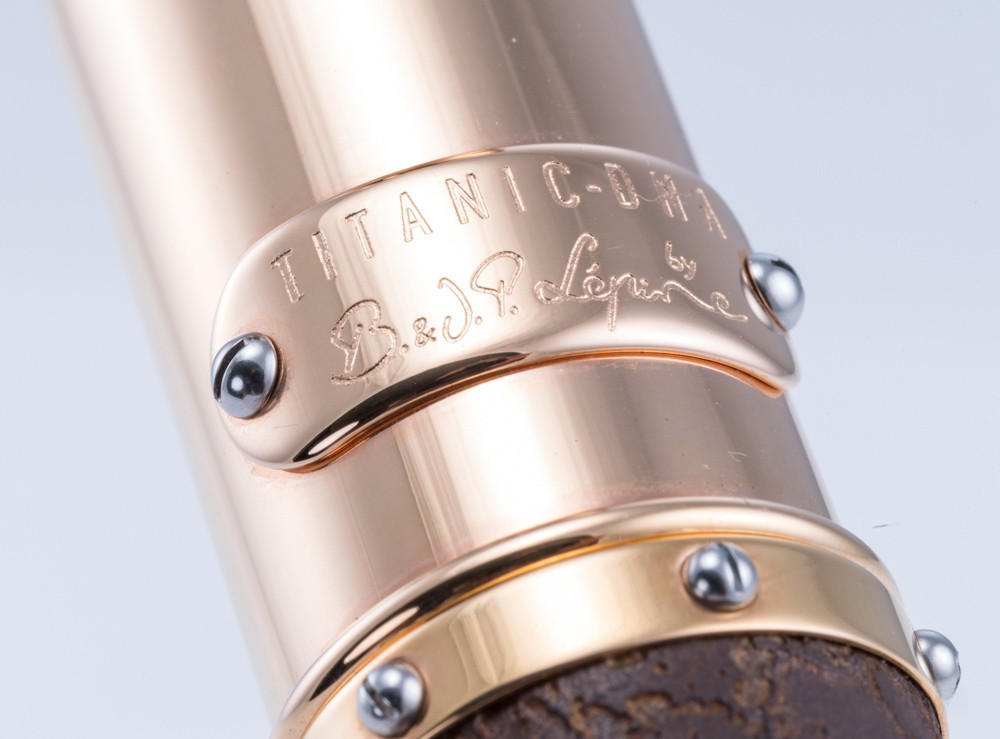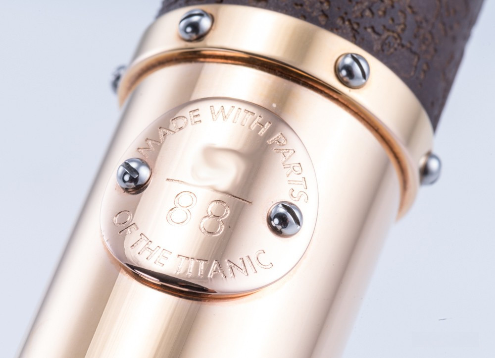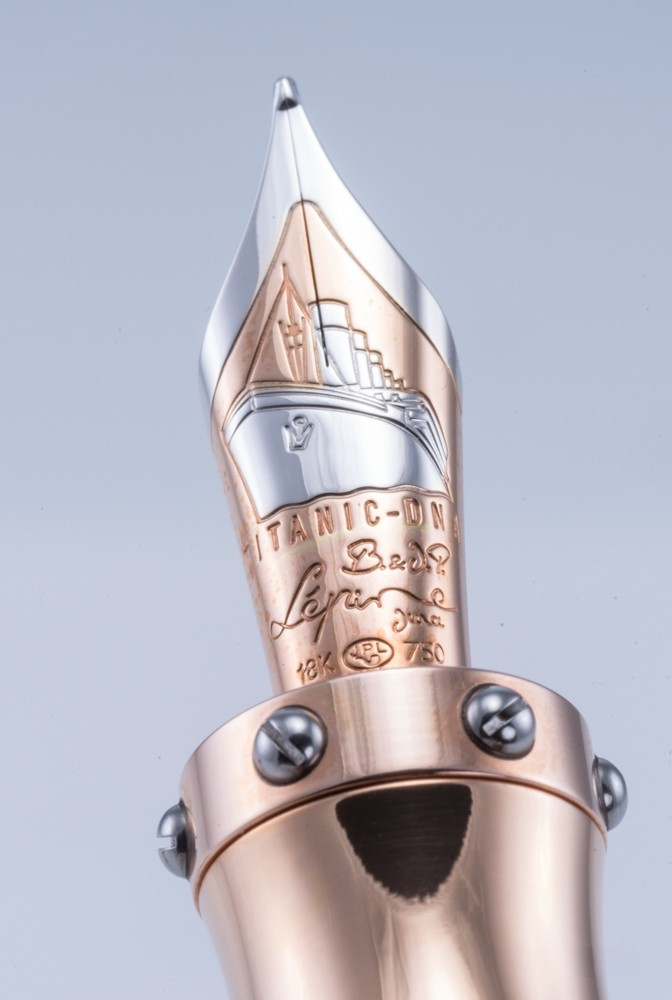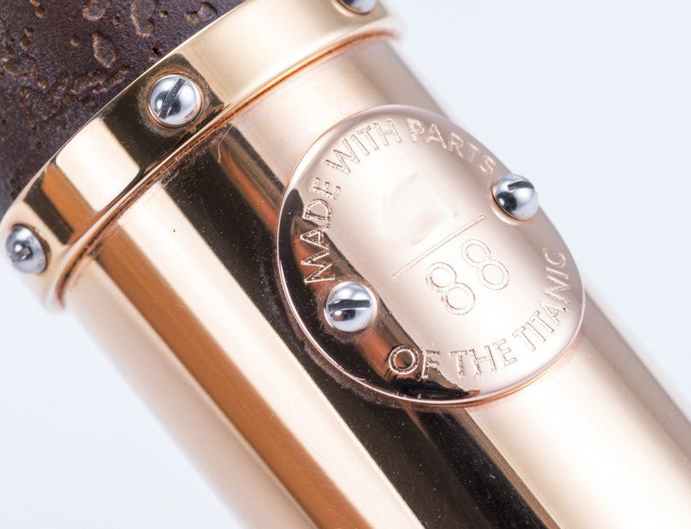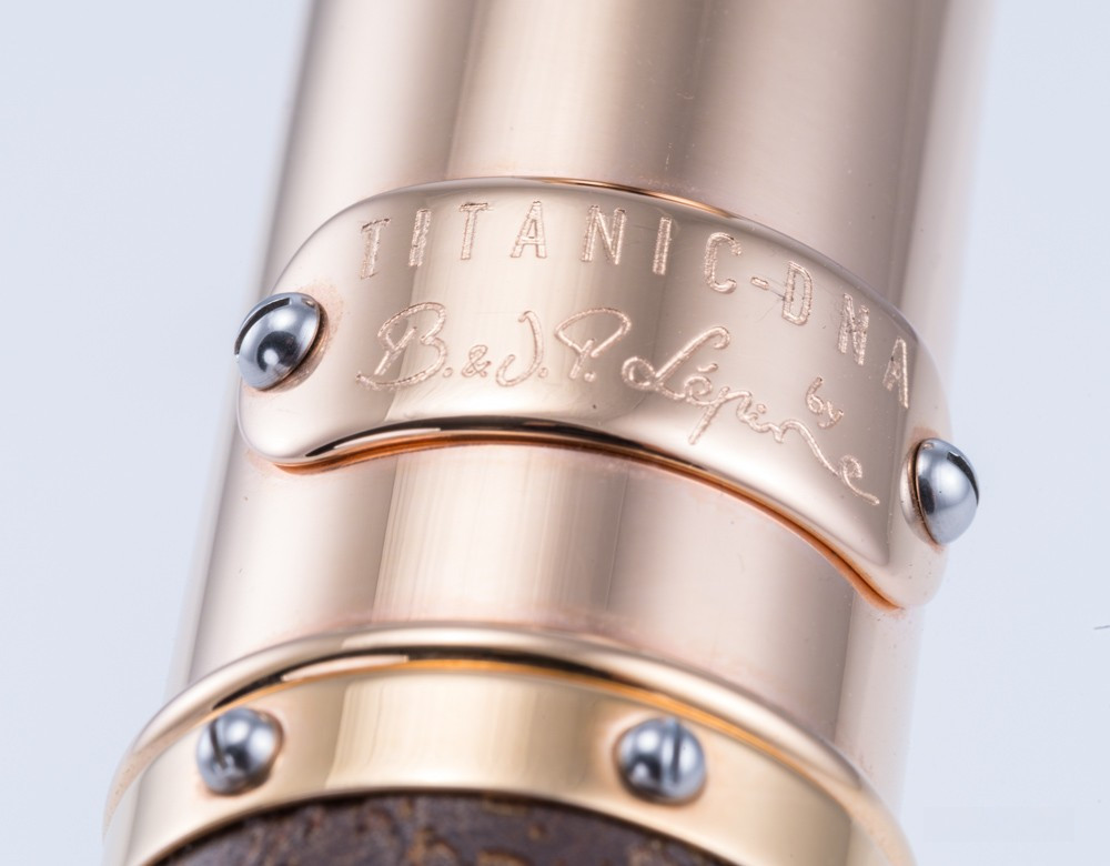 Перьевая ручка Jean Pierre Lepine Titanic Pink Gold Fountain Pen изготовлена из окисленной стали из обломков Титаника и розового золота 18к. Крышка имеет форму вентиляционного отверстия океанского лайнера. Через отверстие в верхней части, покрытое сапфировым стеклом, можно увидеть выгравированный силуэт «Титаника». Пружинный зажим прикручен к задней части крышки. Корпус с несколькими иллюминаторами снабжен прозрачным чернильным стержнем, в котором можно видеть чернила и поршень. Внизу находится пропеллер. При повороте чернильного ролика поршень нагнетает чернила, винт поворачивается, и чернила поступают в перо. Винты, подобные заклепкам «Титаника», украшают корпус ручки. Аксессуар выпущен ограниченной серией 88 шт.