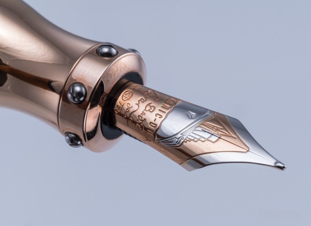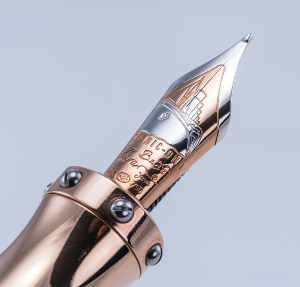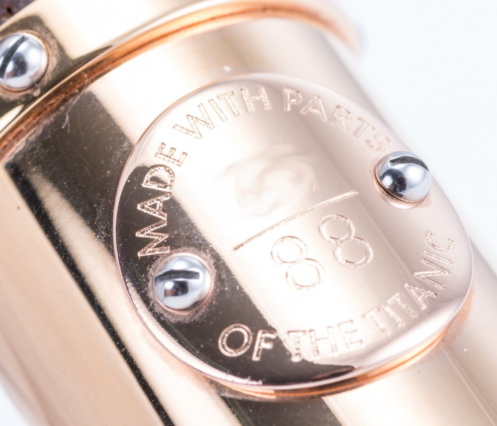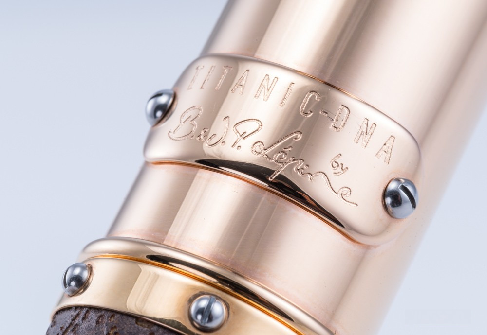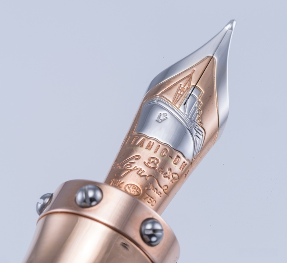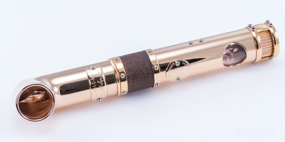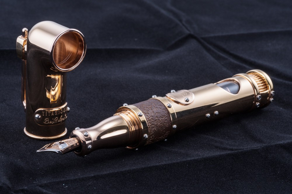 Перьевая ручка Jean Pierre Lepine Titanic Pink Gold Fountain Pen изготовлена из окисленной стали из обломков Титаника и розового золота 18к. Крышка имеет форму вентиляционного отверстия океанского лайнера. Через отверстие в верхней части, покрытое сапфировым стеклом, можно увидеть выгравированный силуэт «Титаника». Пружинный зажим прикручен к задней части крышки. Корпус с несколькими иллюминаторами снабжен прозрачным чернильным стержнем, в котором можно видеть чернила и поршень. Внизу находится пропеллер. При повороте чернильного ролика поршень нагнетает чернила, винт поворачивается, и чернила поступают в перо. Винты, подобные заклепкам «Титаника», украшают корпус ручки. Аксессуар выпущен ограниченной серией 88 шт.