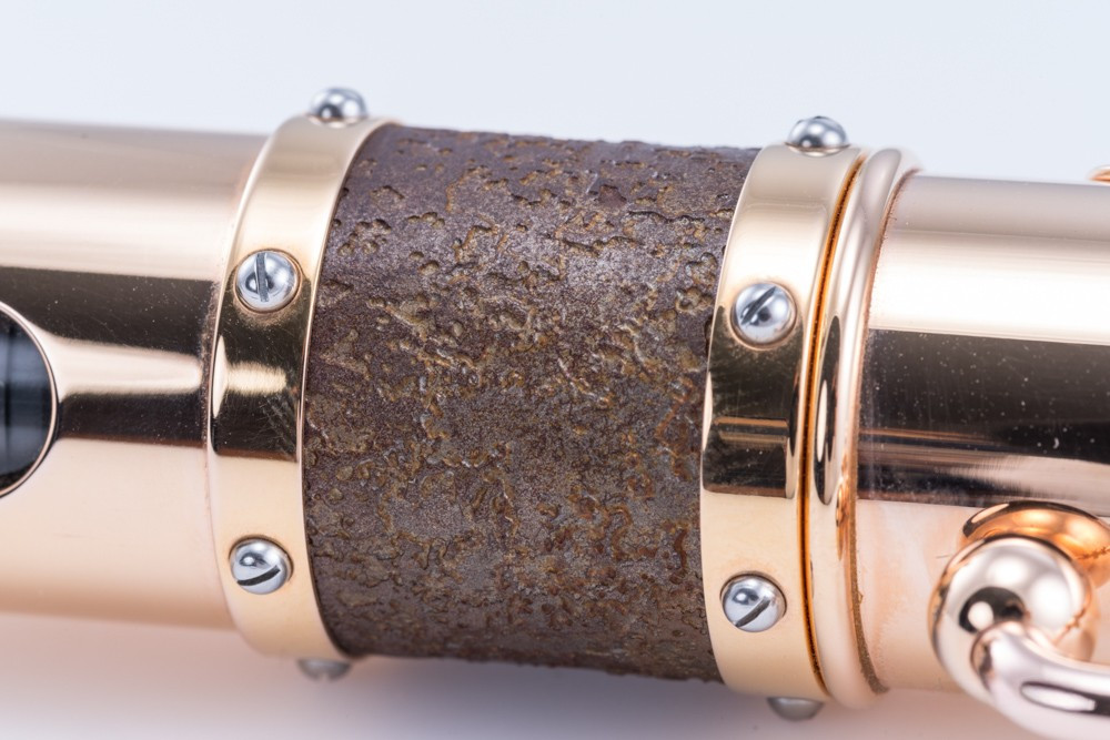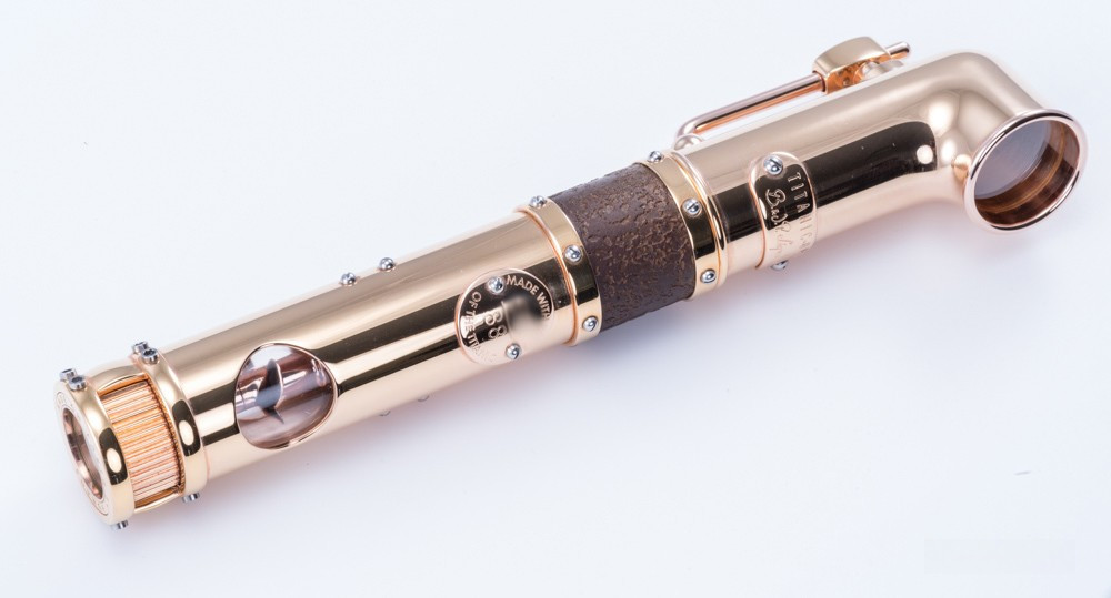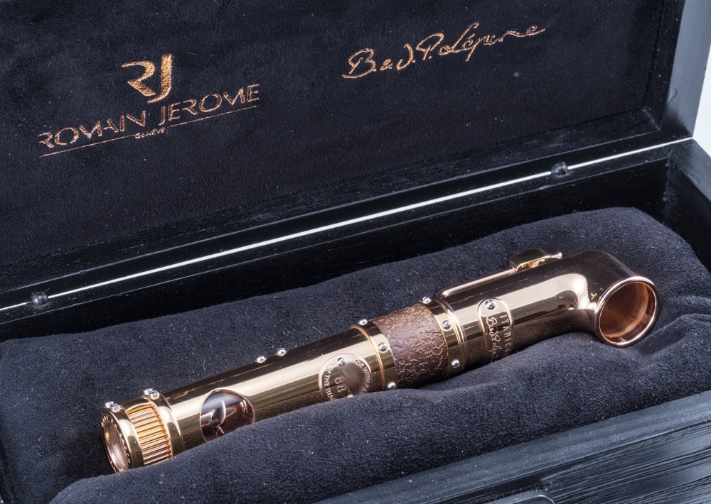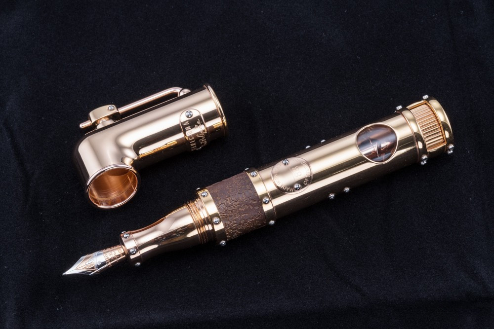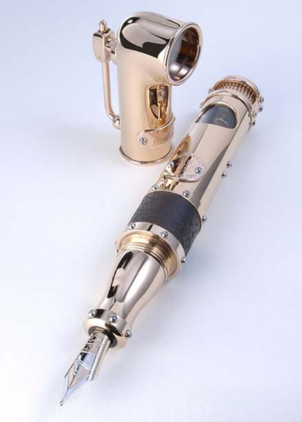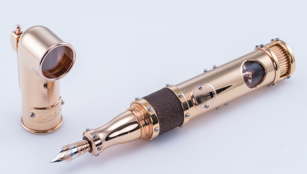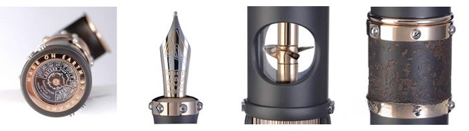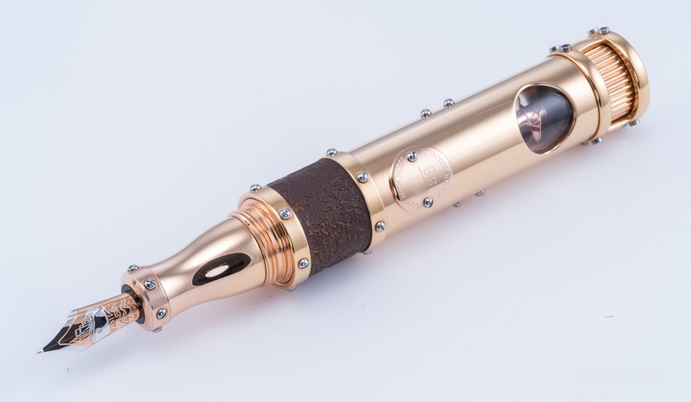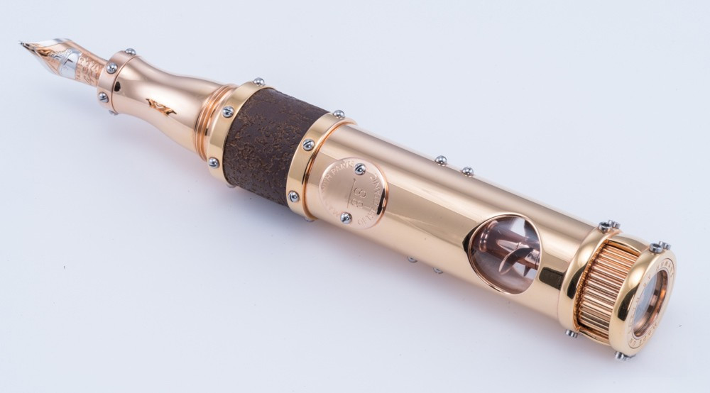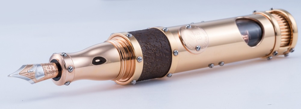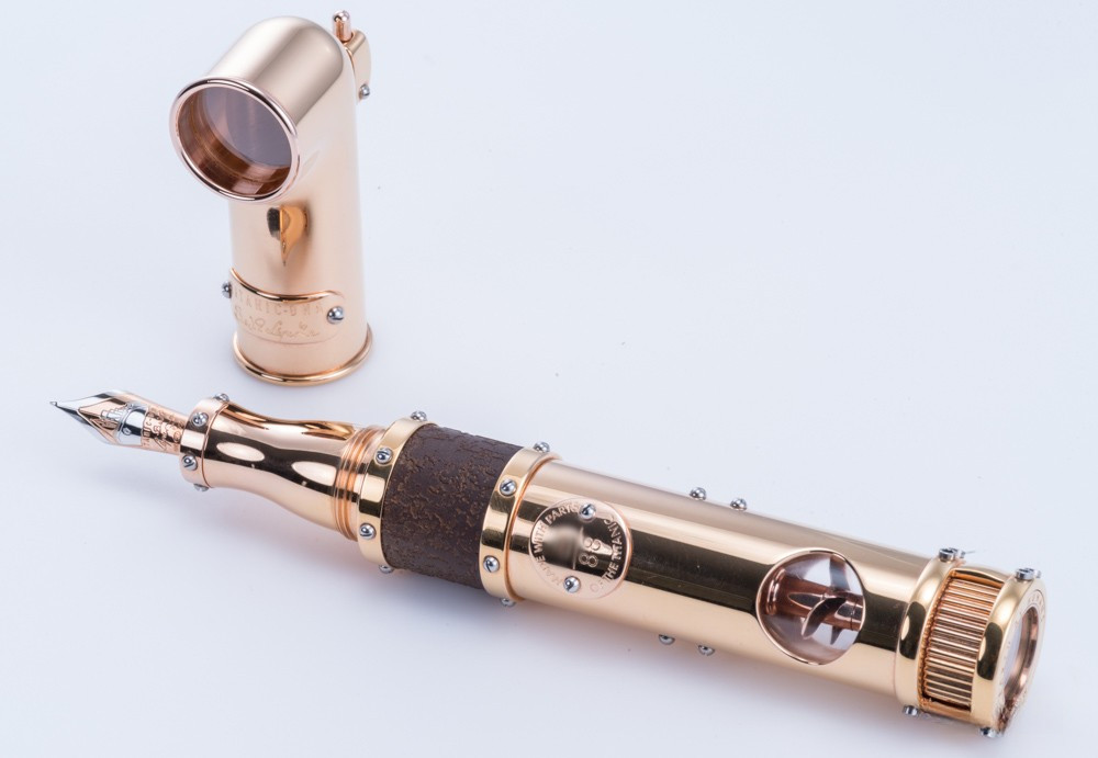 Перьевая ручка Jean Pierre Lepine Titanic Pink Gold Fountain Pen изготовлена из окисленной стали из обломков Титаника и розового золота 18к. Крышка имеет форму вентиляционного отверстия океанского лайнера. Через отверстие в верхней части, покрытое сапфировым стеклом, можно увидеть выгравированный силуэт «Титаника». Пружинный зажим прикручен к задней части крышки. Корпус с несколькими иллюминаторами снабжен прозрачным чернильным стержнем, в котором можно видеть чернила и поршень. Внизу находится пропеллер. При повороте чернильного ролика поршень нагнетает чернила, винт поворачивается, и чернила поступают в перо. Винты, подобные заклепкам «Титаника», украшают корпус ручки. Аксессуар выпущен ограниченной серией 88 шт.