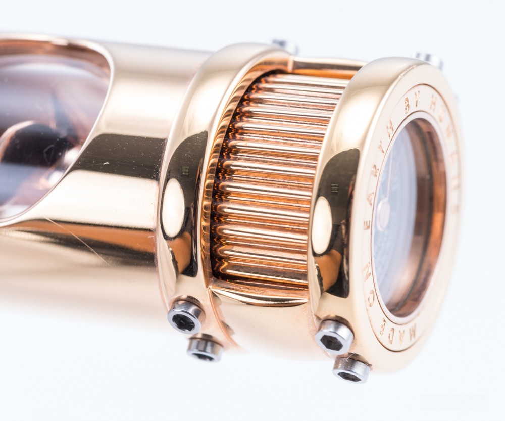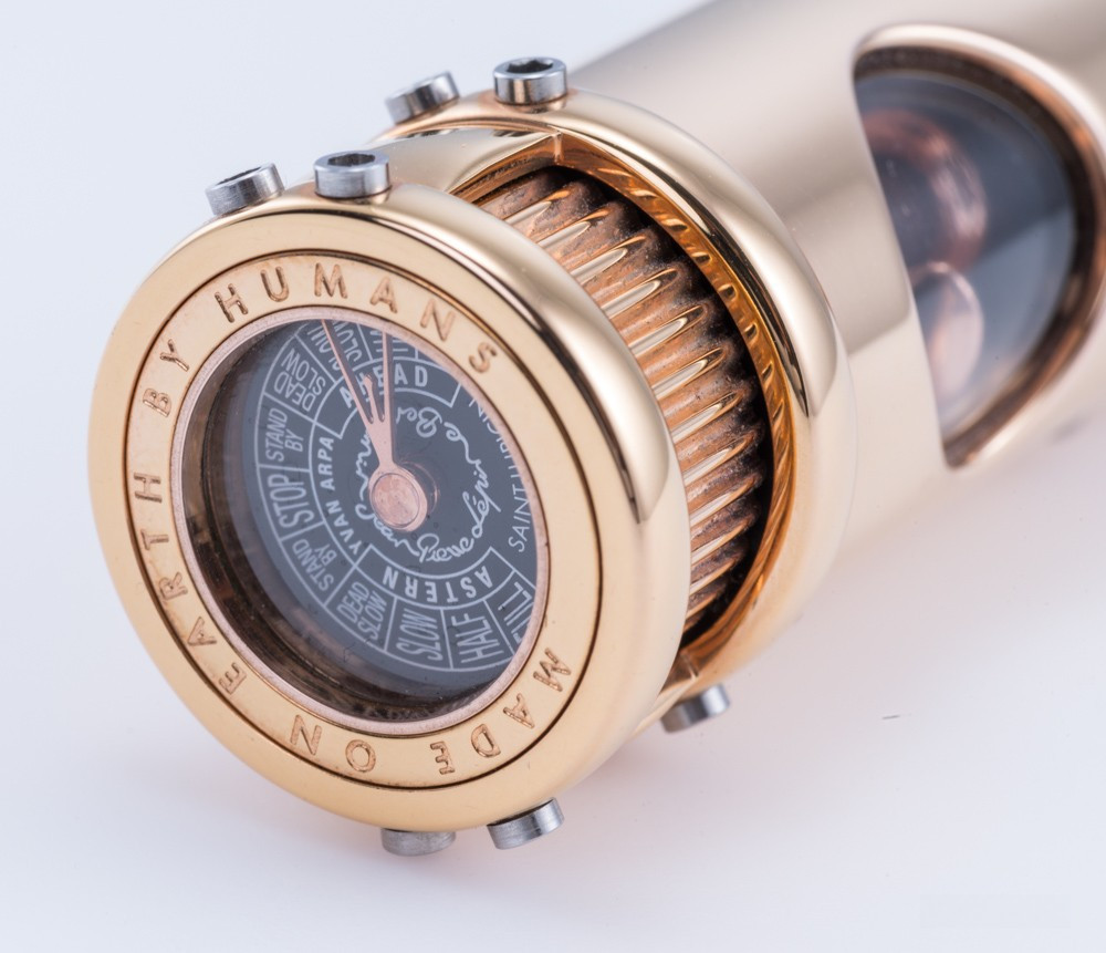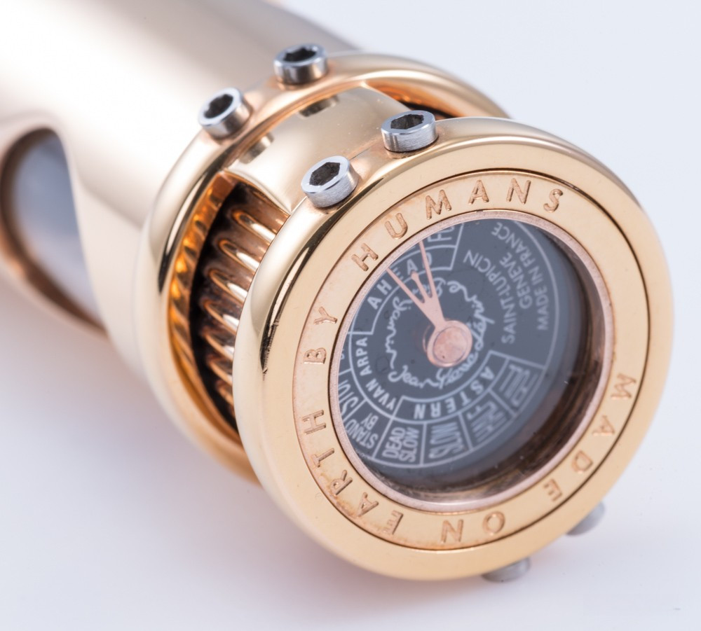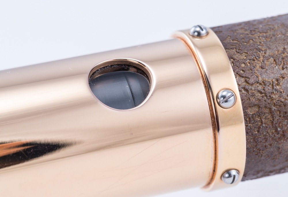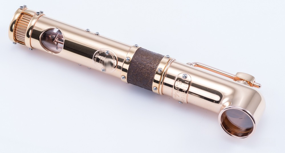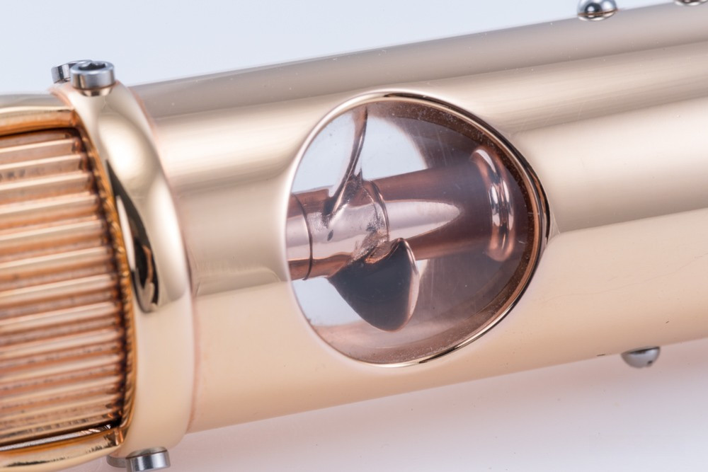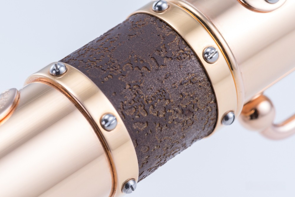 Перьевая ручка Jean Pierre Lepine Titanic Pink Gold Fountain Pen изготовлена из окисленной стали из обломков Титаника и розового золота 18к. Крышка имеет форму вентиляционного отверстия океанского лайнера. Через отверстие в верхней части, покрытое сапфировым стеклом, можно увидеть выгравированный силуэт «Титаника». Пружинный зажим прикручен к задней части крышки. Корпус с несколькими иллюминаторами снабжен прозрачным чернильным стержнем, в котором можно видеть чернила и поршень. Внизу находится пропеллер. При повороте чернильного ролика поршень нагнетает чернила, винт поворачивается, и чернила поступают в перо. Винты, подобные заклепкам «Титаника», украшают корпус ручки. Аксессуар выпущен ограниченной серией 88 шт.