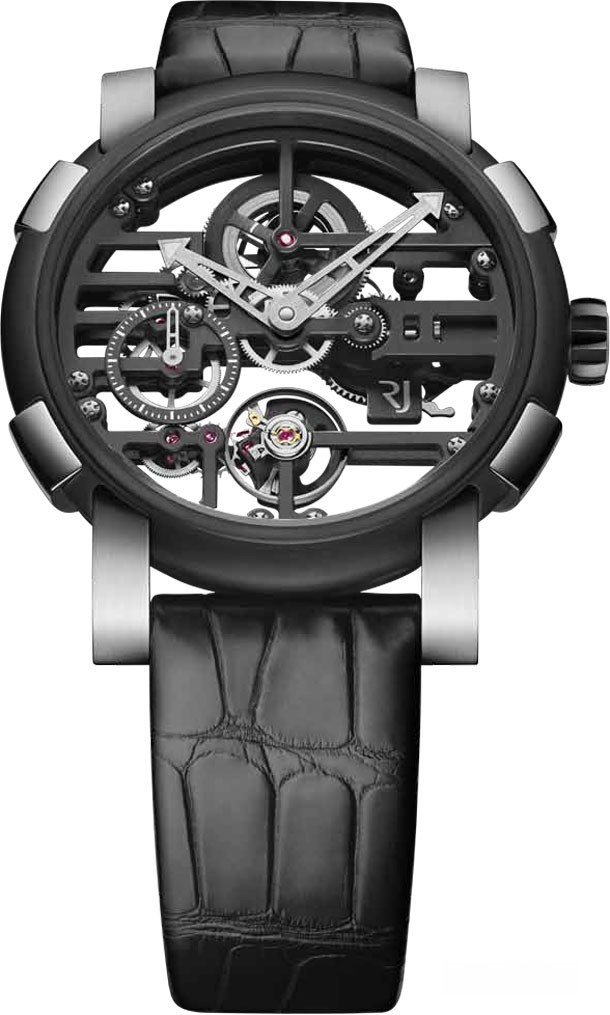 Часы Skylab 48 Speed Metal оснащены Калибром RJ004-М. Частота 28,800 пк/ч. Камни - 21 шт. Запас хода 48 часов. Водонепроницаемость -3 атм (30 метров). Функции – центральная часовая и минутная стрелки, маленькая секундная стрелка на отметке 9 часов. Корпус - 48 мм. Сталь с черным PVD покрытием, содержащая фрагменты космического корабля «Аполлон 11». Задняя крышка корпуса из сапфира. Циферблат черный хромированный скелетонизированный механизм. Стрелки родиевые матовые с покрытием superluminova C1, на наконечники нанесено "синее покрытие". «Лапки» полированная сталь. Безель черная матовая сталь. Ремешок из кожи аллигатора черного цвета. Застежка из стали. Ограниченная серия 99 экземпляров.