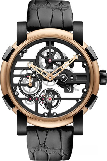 Часы Skylab 48 оснащены Калибром RJ004-М. Частота 28,800 пк/ч. Камни - 21 шт. Запас хода 48 часов. Водонепроницаемость -3 атм (30 метров). Функции – центральная часовая и минутная стрелки, маленькая секундная стрелка на отметке 9 часов. Корпус - 48 мм. Сталь с черным PVD покрытием, розовое золото 18к. Задняя крышка корпуса из сапфира. Циферблат черный хромированный скелетонизированный механизм. Ремешок из кожи аллигатора черного цвета. Застежка из стали.