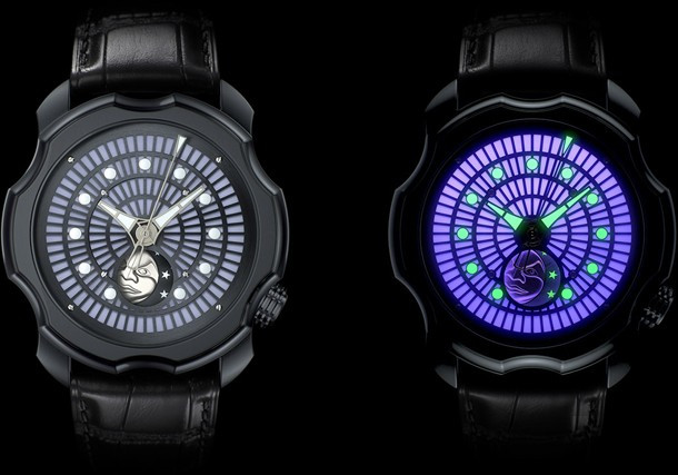 Часы обладают особенной функцией, но придется ждать ночи, чтобы увидеть ее. Новые часы Sarpaneva Korona K0 Northern Lights созданы на основе спортивной модели K0. Часам, диаметром 46 мм, вернули дизайн острого, угловатого корпуса ручной работы, выполненного в мастерской города Хельсинки. Заводная головка расположена напротив цифры 4. Sarpaneva Korona K0 Northern Lights обладают накладными индексами и стрелками с покрытием Super LumiNova. Часы водонепроницаемы на глубине до 100 метров. Циферблат состоит из прозрачной основы в светло-зеленом, светло-голубом либо светло-фиолетовом цвете DLC. Основа циферблата покрыта скелетонированной решетчатой пластиной темно-зеленого, темно-синего либо темно-фиолетового цвета. Часы обладают индикатором фазы Луны, который можно увидеть на цифре 6. На циферблате часов можно увидеть резные звезды и лик Лун Sarpaneva из белого или розового золота. Часы Sarpaneva Korona K0 Northern Lights оснащены автоматическим механизмом. Калибр Soprod А10, модифицирован модулем индикации фазы Луны. Запас хода модели 42 часа. Модель доступна на кожаном ремешке.