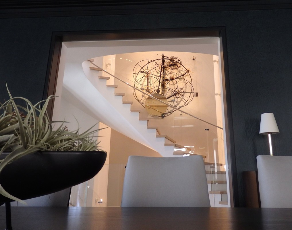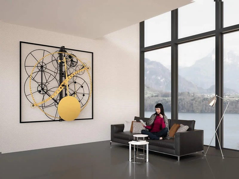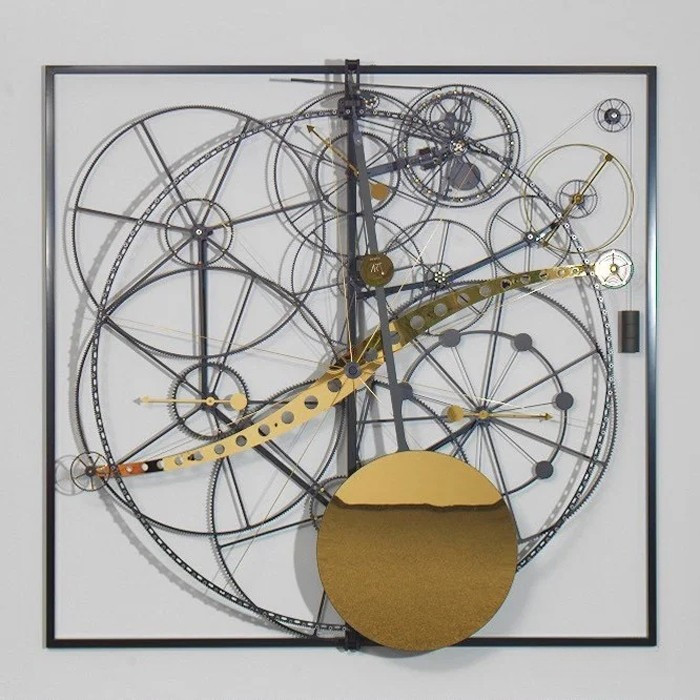 Настенные часы Schlumpf Time Machines TM4 представлены в корпусе из нержавеющей стали, анодированного алюминия. На скелетированном циферблате отображаются часы, минуты.