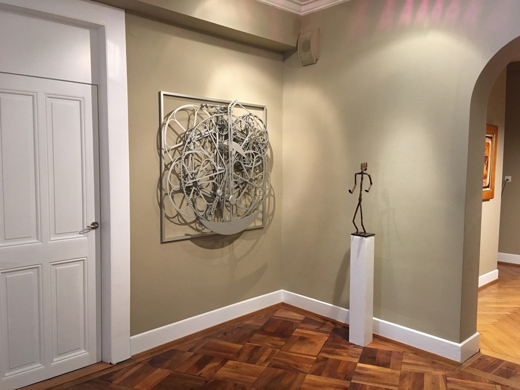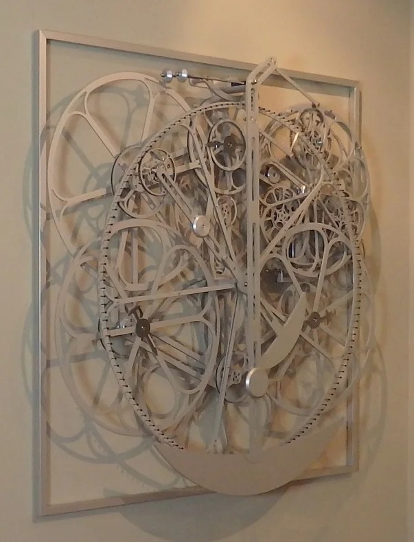 Настенные часы Schlumpf Time Machines TM5 представлены в корпусе из анодированного алюминия размером 1250 x 1250 x 180 мм. На скелетированном циферблате отображаются часы, минуты.