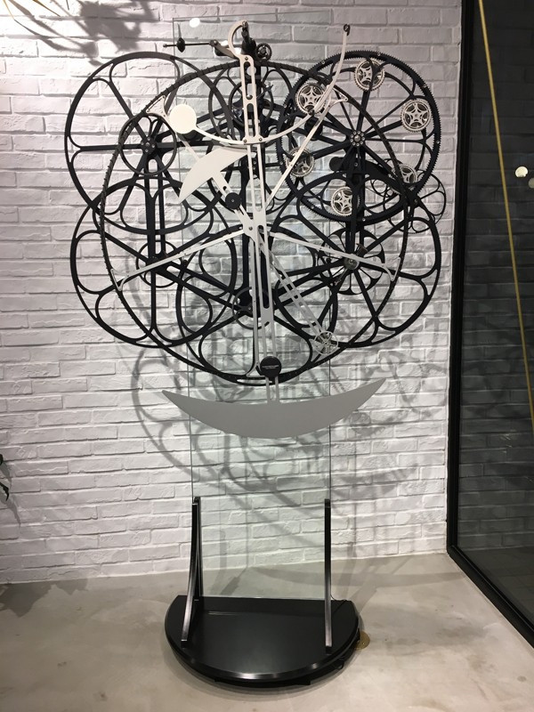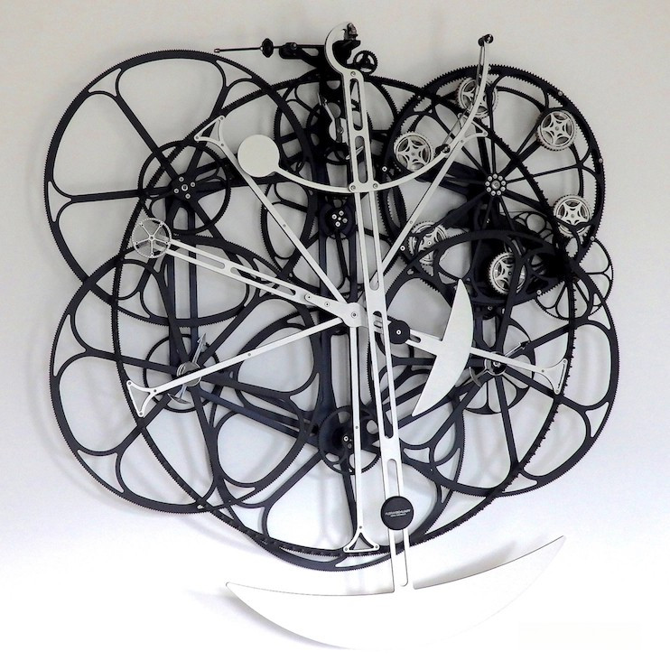 Настенные часы Schlumpf Time Machines TM5 представлены в корпусе из анодированного алюминия размером 1250 x 1250 x 180 мм. На скелетированном циферблате отображаются часы, минуты.