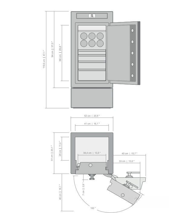 119 см (основание 24 см, сейф 95 см) см х 52 см х 51 см