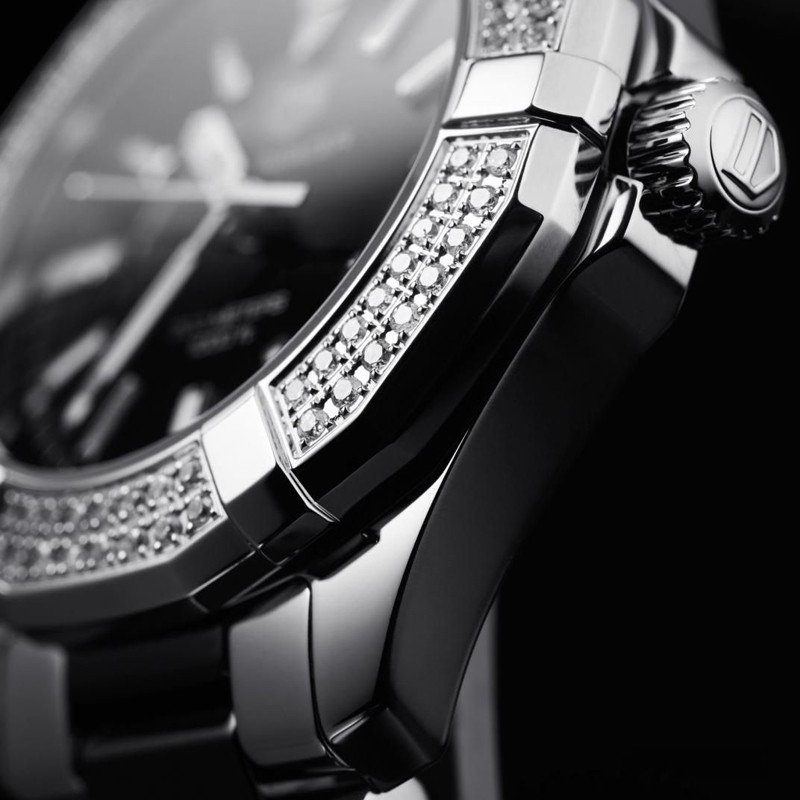 Часы TAG Heuer Aquaracer Quartz 35 mm представлены в корпусе из нержавеющей стали размером 35 мм водонепроницаемостью 300 метров. Внутри корпуса установлен кварцевый механизм. На черном циферблате отображаются часы, минуты, секунды, дата. Часы поставляются на браслете из нержавеющей стали и керамики. Безель из белых бриллиантов.