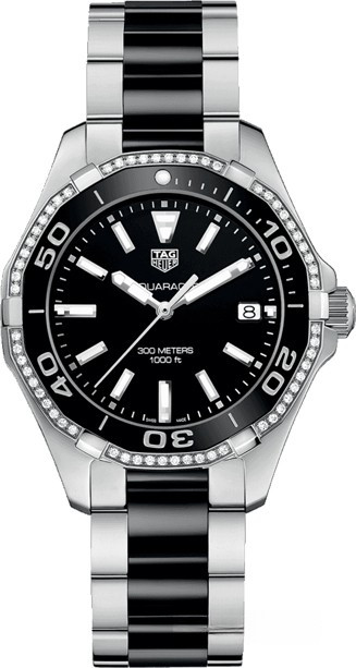 Часы TAG Heuer Aquaracer Quartz 35 mm представлены в корпусе из нержавеющей стали с керамическим безелем размером 35 мм водонепроницаемостью 300 метров. Внутри корпуса установлен кварцевый механизм. На черном циферблате отображаются часы, минуты, секунды, дата. Часы поставляются на браслете из нержавеющей стали и керамики. Безель из белых бриллиантов.