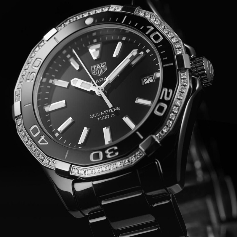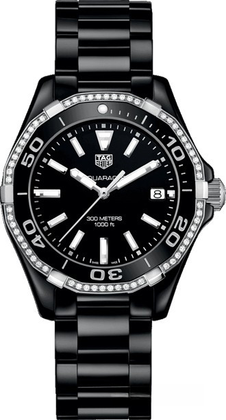 Часы TAG Heuer Aquaracer Quartz 35 mm представлены в корпусе из керамики и нержавеющей стали размером 35 мм водонепроницаемостью 300 метров. Внутри корпуса установлен кварцевый механизм. На черном циферблате отображаются часы, минуты, секунды, дата. Часы поставляются на браслете из керамики. Безель из белых бриллиантов.