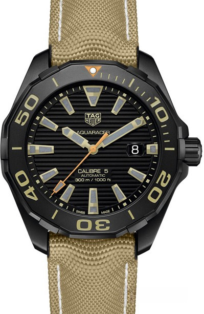 Новинка имеет круглый корпус, изготовленный из титана с черным карбидным покрытием, диаметром 43 мм, водонепроницаемый до 300 метров. На торце защищенной завинчивающейся рифленой заводной головки, расположенной на 3 часах, выгравирована эмблема бренда TAG Heuer. Вращающийся однонаправленный керамический дайверский безель. Сапфировое стекло, с антибликовым покрытием и встроенной лупой над указателем даты на 3 часах, защищает циферблат матово-черного цвета, отделанный горизонтальными полосками, с накладными часовыми индексами, покрытыми, как и стрелки, люминесцентным составом. Модель оснащена швейцарским автоматическим механизмом TAG Heuer Calibre 5 (базовый калибр Sellita SW200), с балансовой частотой 28800 полуколебаний в час (4 гц), 38-часовым запасом хода, функциями индикации часов, минут, секунд (посредством соответствующих центральных стрелок) и даты (посредством соответствующего цифрового указателя в прямоугольной апертуре, расположенной на 3 часах). Поставляется на нейлоновом ремешке бежевого цвета с застежкой из титана с черным карбидным покрытием.