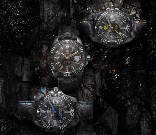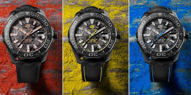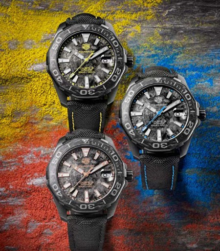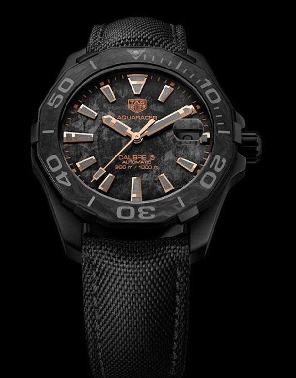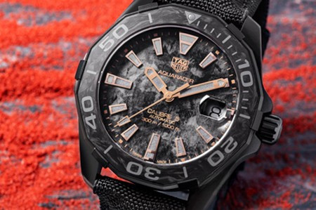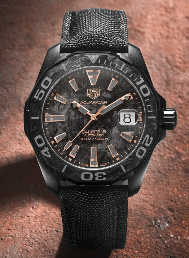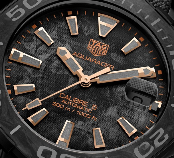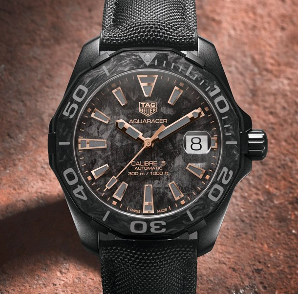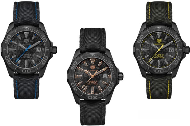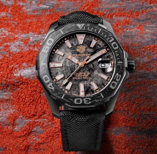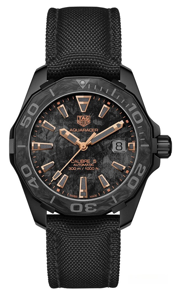 TAG Heuer представляет Aquaracer Carbon Edition, новую модель с черным корпусом из титана с покрытием PVD, усиленным карбоновым безелем. Ультралегкие и износостойкие, часы для дайвинга от TAG Heuer отличаются акцентами синего, желтого цветов, или же элементами из розового золота 18к. Как и коронка часов безель с 60-минутной шкалой выполнен из нержавеющей стали с черным PVD-покрытием, имеет карбоновую вставку. Благодаря хаотичной инъекции углеродных волокон в прессованный при высоких температурах каучук, каждая деталь уникальна, имеет эксклюзивный черно-серый мраморный узор. Водонепроницаемость корпуса до 300 м. Корпус диаметром 41 мм опоясывает циферблат с рисунком, имитирующим карбоновое волокно. На нем расположены накладные часовые индексы, часовая и минутная стрелки, покрытые серым Super-LumiNova. Внутри корпуса установлен швейцарский автоматический механизм, Калибр 5, созданный на базе Swiss Sellita SW200. Балансовая частота составляет 28 800 пк/час, запас хода 38 часов. Часы поставляются на черном текстильном ремешке со строчкой, соответствующей цвету на циферблате. Титановая раскладывающаяся застежка оснащена двойными предохранительными кнопками и удлинителем для дайвинга.
