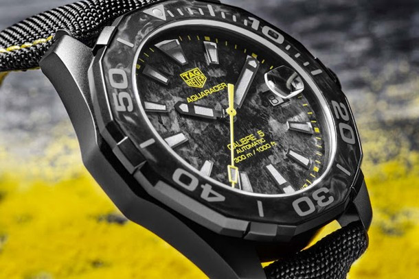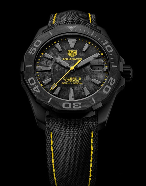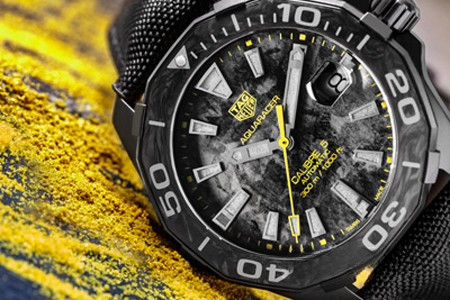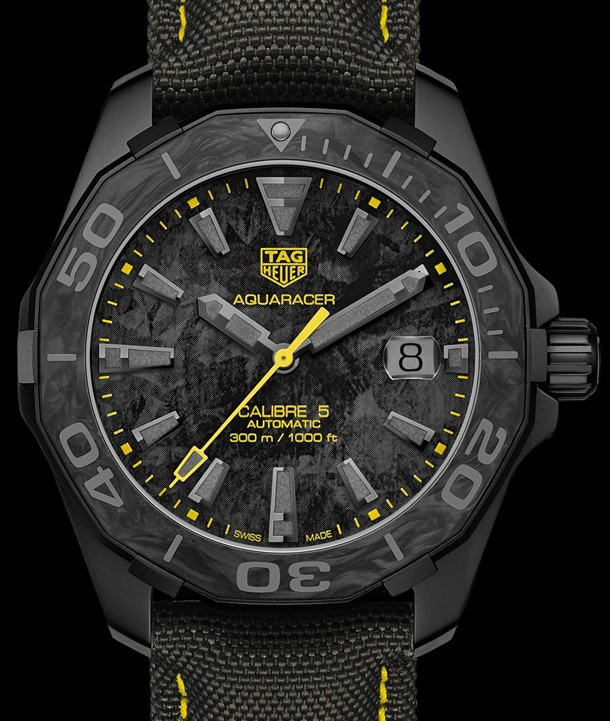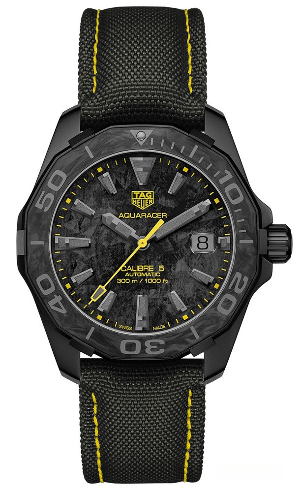 TAG Heuer представляет Aquaracer Carbon Edition, новую модель с черным корпусом из титана с покрытием PVD, усиленным карбоновым безелем. Ультралегкие и износостойкие, часы для дайвинга от TAG Heuer отличаются акцентами синего, желтого цветов, или же элементами из розового золота 18к. Как и коронка часов безель с 60-минутной шкалой выполнен из нержавеющей стали с черным PVD-покрытием, имеет карбоновую вставку. Благодаря хаотичной инъекции углеродных волокон в прессованный при высоких температурах каучук, каждая деталь уникальна, имеет эксклюзивный черно-серый мраморный узор. Водонепроницаемость корпуса до 300 м. Корпус диаметром 41 мм опоясывает циферблат с рисунком, имитирующим карбоновое волокно. На нем расположены накладные часовые индексы, часовая и минутная стрелки, покрытые серым Super-LumiNova. Внутри корпуса установлен швейцарский автоматический механизм, Калибр 5, созданный на базе Swiss Sellita SW200. Балансовая частота составляет 28 800 пк/час, запас хода 38 часов. Часы поставляются на черном текстильном ремешке со строчкой, соответствующей цвету на циферблате. Титановая раскладывающаяся застежка оснащена двойными предохранительными кнопками и удлинителем для дайвинга.