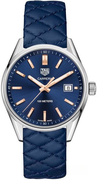 Часы TAG Heuer Carrera Lady Rose Gold Accents 39mm представлены в корпусе из нержавеющей стали диаметром 39 мм водонепроницаемостью 100 метров. Внутри корпуса нахоится кварцевый механизм с индикацией часов, минут, секунд и даты. На синем циферблате стрелки расположенф по центру, апертура даты находится на 3-х часах. Часы комплектуются стеганым кожаным ремешком со стальной застежкой.