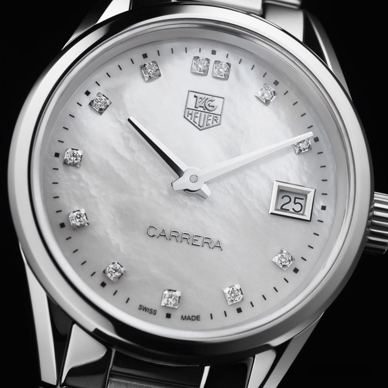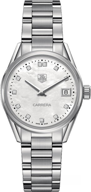Часы TAG Heuer Carrera Quartz 32 mm представлены в корпусе из нержавеющей стали размером 32 мм водонепроницаемостью 100 метров. Внутри корпуса установлен кварцевый механизм. На белом жемчужном циферблате с 12-ю белыми бриллиантами отображаются часы, минуты, дата. Часы поставляются на браслете из нержавеющей стали.