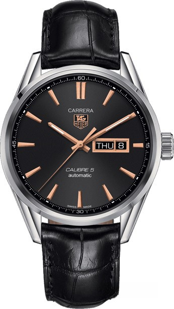 Часы TAG Heuer Carrera Calibre 5 Day Date представлены в корпусе из нержавеющей стали размером 41 мм водонепроницаемостью 100 метров. Внутри корпуса установлен автоматический механизм, Калибр 5, обладающий запасом хода 38 часов. На черном циферблате отображаются часы, минуты, секунды, дата, день недели. Часы поставляются на ремешке из кожи аллигатора с вставкой из нержавеющей стали.