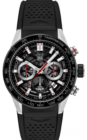 Часы TAG Heuer Calibre Heuer 02 представлены в корпусе из нержавеющей стали размером 43 мм водонепроницаемостью 100 метров. Внутри корпуса установлен автоматический механизм с функцией хронографа, Калибр Heuer 02, обладающий запасом хода 80 часов. На черном скелетированном циферблате отображаются часы, минуты, секунды, дата, тахиметр, накопители хронографа. Часы поставляются на каучуковом ремешке с вставкой из нержавеющей стали.