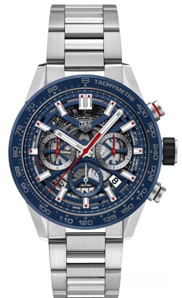 Часы TAG Heuer Calibre Heuer 02 представлены в корпусе из нержавеющей стали размером 43 мм водонепроницаемостью 100 метров. Внутри корпуса установлен автоматический механизм с функцией хронографа, Калибр Heuer 02, обладающий запасом хода 80 часов. На синем скелетированном циферблате отображаются часы, минуты, секунды, дата, тахиметр, накопители хронографа. Часы поставляются на браслете из нержавеющей стали.