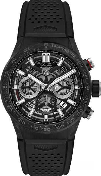 Часы TAG Heuer Calibre Heuer 02 представлены в корпусе из карбона размером 43 мм водонепроницаемостью 100 метров. Внутри корпуса установлен автоматический механизм с функцией хронографа, Калибр Heuer 02, обладающий запасом хода 80 часов. На черном скелетированном циферблате отображаются часы, минуты, секунды, дата, тахиметр, накопители хронографа. Часы поставляются на каучуковом ремешке с вставкой из титана.