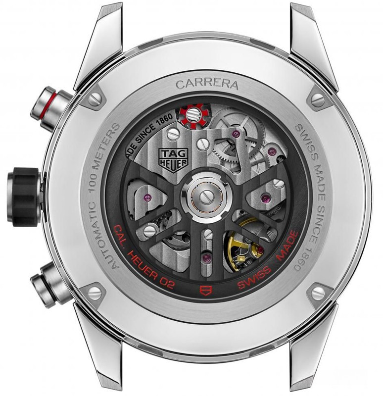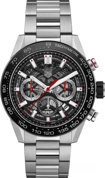 Часы TAG Heuer Calibre Heuer 02 представлены в корпусе из нержавеющей стали с керамическим безелем размером 45 мм водонепроницаемостью 100 метров. Внутри корпуса установлен автоматический механизм с функцией хронографа, Калибр Heuer 02. На сером отображаются часы, минуты, секунды, дата, тахиметр, накопители хронографа. Часы поставляются на браслете из нержавеющей стали.