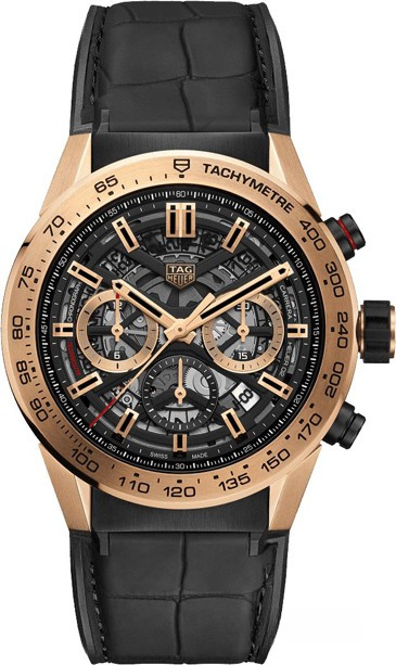 Часы TAG Heuer Calibre Heuer 02 представлены в корпусе из титана и розового золота 18к размером 45 х 16.5 мм водонепроницаемостью 100 метров. Внутри корпуса установлен автоматический механизм с функцией хронографа, Калибр Heuer 02. На черном циферблате отображаются часы, минуты, секунды, дата, тахиметр, накопители хронографа. Часы поставляются на ремешке из кожи аллигатора с вставкой из титана.