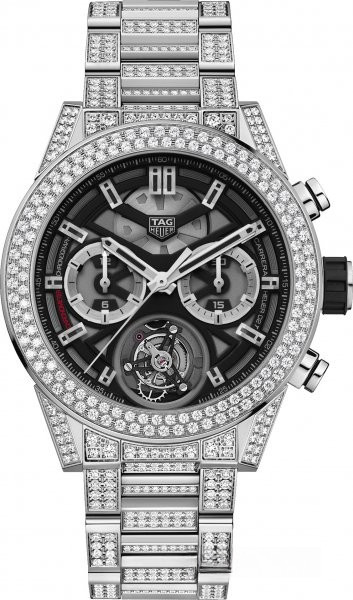 Tag Heuer Carrera Heuer-02Т Tourbillon имеет модульную конструкцию корпуса диаметром 45 мм, позволяющую легко создавать новые стили. Центральная часть, выступы с независимыми центральными вставками, выделяющийся безель – корпус состоит из 12 модульных компонентов. TAG Heuer Carrera Heuer-02Т Tourbillon имеют полу-скелетонизированный циферблат, который на самом деле прозрачный и имеет сапфировое стекло со шкалами для субциферблатов и индексами, демонстрируя скелетонизированные мосты и палеты часового механизма. Барабан с основной пружиной можно увидеть в позиции 12 часов, несколько колес видны сквозь субциферблаты. Основное внимание на циферблате привлекает турбийон возле 6 часов. TAG Heuer утверждают, что в основе часового механизма Carrera Heuer-02Т Tourbillon лежит Калибр СН-80, что означает наличие автоматического завода со встроенным механизмом хронографа, который работает с помощью колонного колеса. Часовой механизм обеспечивает значительные 65 часов запаса хода и сертифицирован COSC. Классический турбийон делает один оборот в минуту и работает с частотой 4 Гц. Он имеет балансовое колесо, пружину, спусковое колесо и палетную вилку – все, что находится в клети, которая вращается на центральной оси.