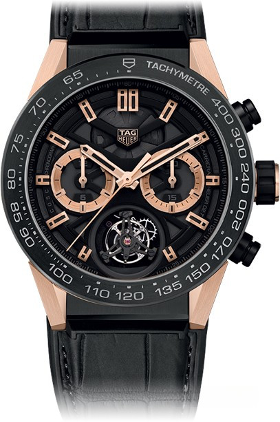 Tag Heuer Carrera Heuer-02Т Tourbillon имеет модульную конструкцию корпуса диаметром 45 мм, позволяющую легко создавать новые стили. Центральная часть, выступы с независимыми центральными вставками, выделяющийся безель – корпус состоит из 12 модульных компонентов. TAG Heuer Carrera Heuer-02Т Tourbillon имеют полу-скелетонизированный циферблат, который на самом деле прозрачный и имеет сапфировое стекло со шкалами для субциферблатов и индексами, демонстрируя скелетонизированные мосты и палеты часового механизма. Барабан с основной пружиной можно увидеть в позиции 12 часов, несколько колес видны сквозь субциферблаты. Основное внимание на циферблате привлекает турбийон возле 6 часов. TAG Heuer утверждают, что в основе часового механизма Carrera Heuer-02Т Tourbillon лежит Калибр СН-80, что означает наличие автоматического завода со встроенным механизмом хронографа, который работает с помощью колонного колеса. Часовой механизм обеспечивает значительные 65 часов запаса хода и сертифицирован COSC. Классический турбийон делает один оборот в минуту и работает с частотой 4 Гц. Он имеет балансовое колесо, пружину, спусковое колесо и палетную вилку – все, что находится в клети, которая вращается на центральной оси.