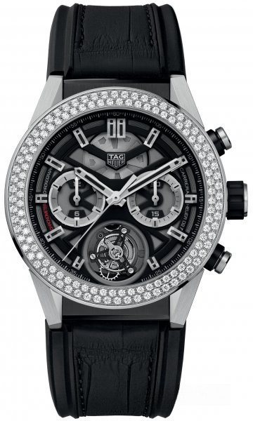 Tag Heuer Carrera Heuer-02Т Tourbillon имеет модульную конструкцию корпуса диаметром 45 мм, позволяющую легко создавать новые стили. Центральная часть, выступы с независимыми центральными вставками, выделяющийся безель – корпус состоит из 12 модульных компонентов. TAG Heuer Carrera Heuer-02Т Tourbillon имеют полу-скелетонизированный циферблат, который на самом деле прозрачный и имеет сапфировое стекло со шкалами для субциферблатов и индексами, демонстрируя скелетонизированные мосты и палеты часового механизма. Барабан с основной пружиной можно увидеть в позиции 12 часов, несколько колес видны сквозь субциферблаты. Основное внимание на циферблате привлекает турбийон возле 6 часов. TAG Heuer утверждают, что в основе часового механизма Carrera Heuer-02Т Tourbillon лежит Калибр СН-80, что означает наличие автоматического завода со встроенным механизмом хронографа, который работает с помощью колонного колеса. Часовой механизм обеспечивает значительные 65 часов запаса хода и сертифицирован COSC. Классический турбийон делает один оборот в минуту и работает с частотой 4 Гц. Он имеет балансовое колесо, пружину, спусковое колесо и палетную вилку – все, что находится в клети, которая вращается на центральной оси.
