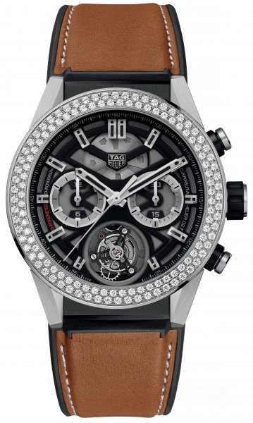 Tag Heuer Carrera Heuer-02Т Tourbillon имеет модульную конструкцию корпуса диаметром 45 мм, позволяющую легко создавать новые стили. Центральная часть, выступы с независимыми центральными вставками, выделяющийся безель – корпус состоит из 12 модульных компонентов. TAG Heuer Carrera Heuer-02Т Tourbillon имеют полу-скелетонизированный циферблат, который на самом деле прозрачный и имеет сапфировое стекло со шкалами для субциферблатов и индексами, демонстрируя скелетонизированные мосты и палеты часового механизма. Барабан с основной пружиной можно увидеть в позиции 12 часов, несколько колес видны сквозь субциферблаты. Основное внимание на циферблате привлекает турбийон возле 6 часов. TAG Heuer утверждают, что в основе часового механизма Carrera Heuer-02Т Tourbillon лежит Калибр СН-80, что означает наличие автоматического завода со встроенным механизмом хронографа, который работает с помощью колонного колеса. Часовой механизм обеспечивает значительные 65 часов запаса хода и сертифицирован COSC. Классический турбийон делает один оборот в минуту и работает с частотой 4 Гц. Он имеет балансовое колесо, пружину, спусковое колесо и палетную вилку – все, что находится в клети, которая вращается на центральной оси.