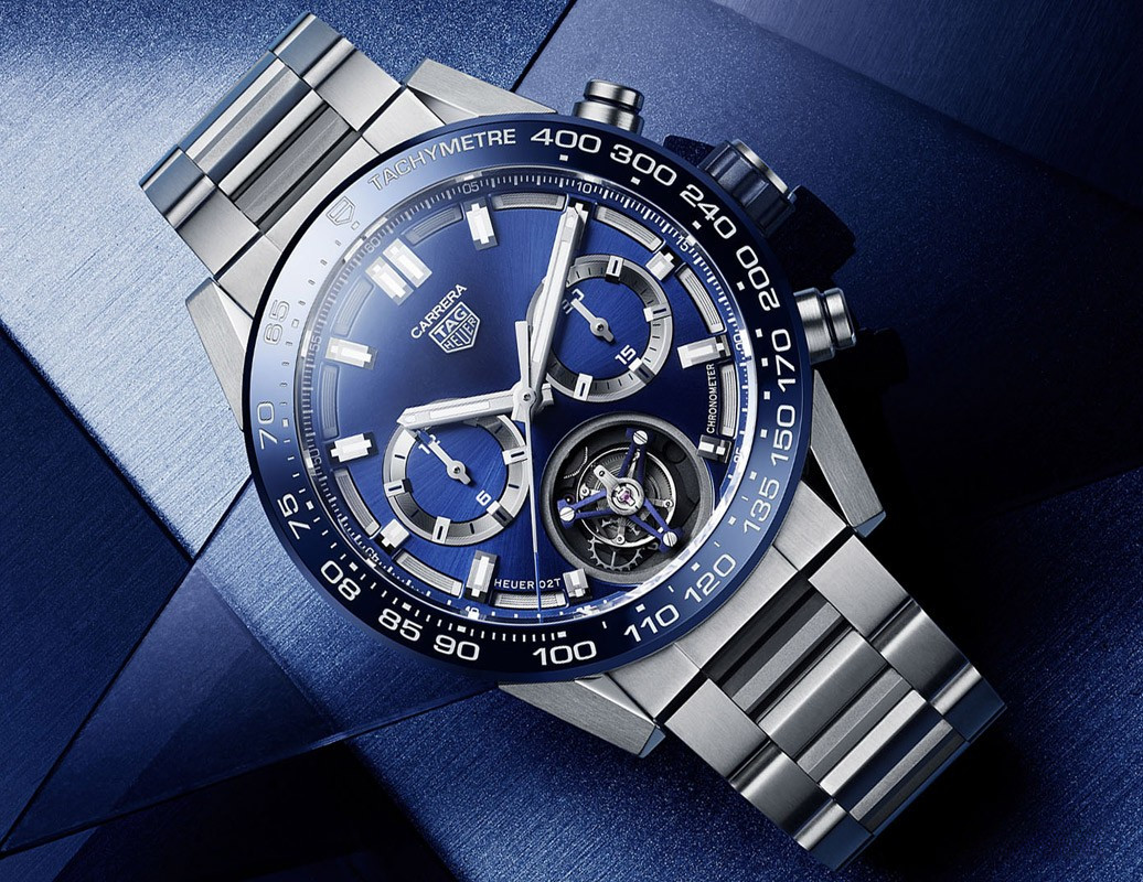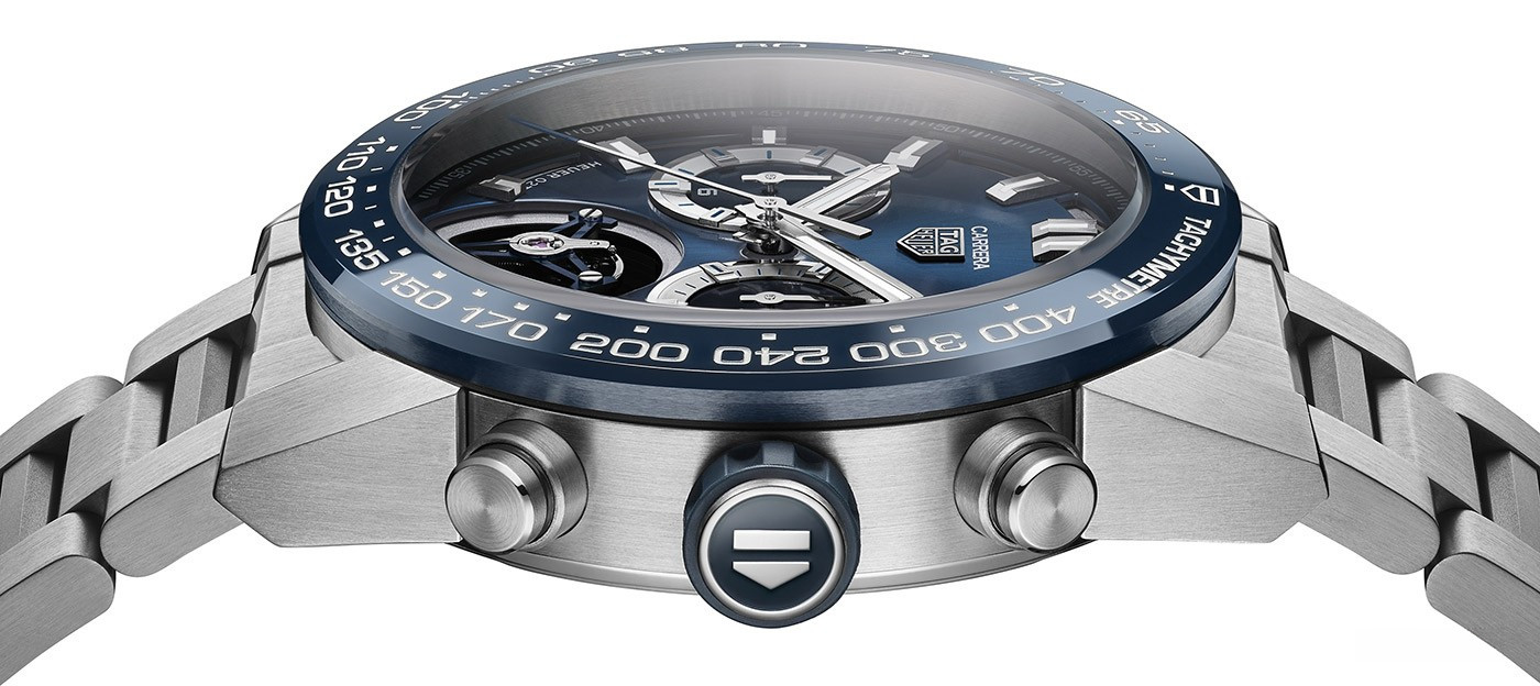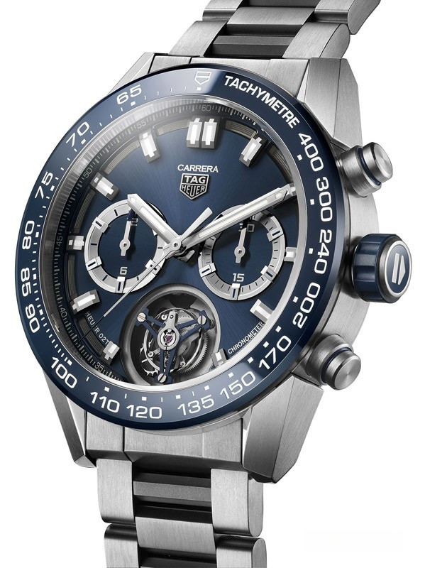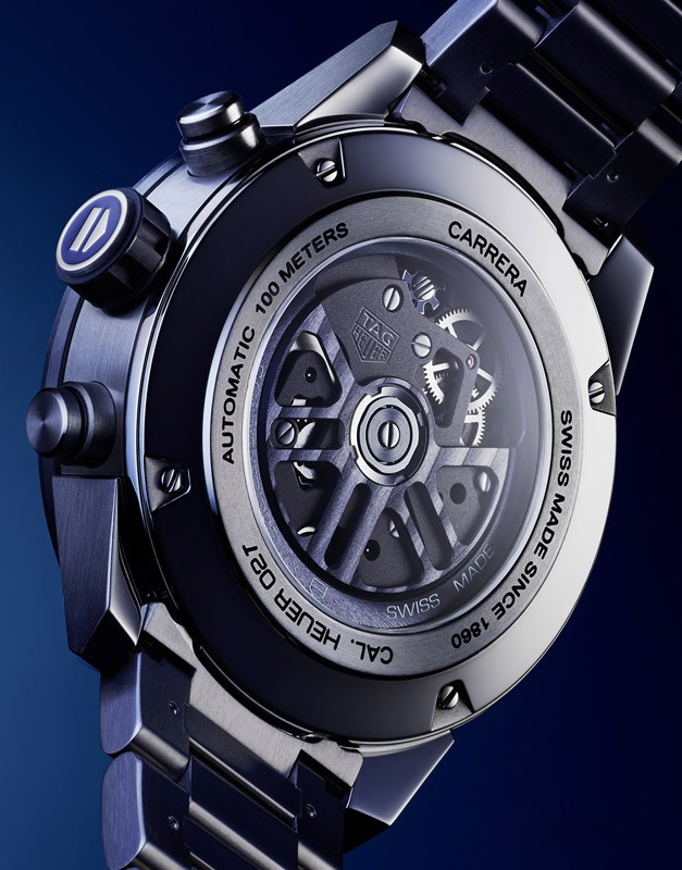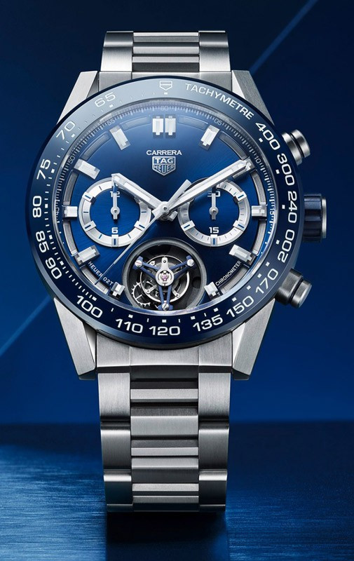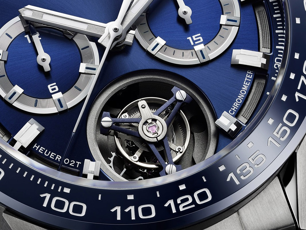 Tag Heuer Carrera Heuer-02Т Tourbillon имеет модульную конструкцию корпуса диаметром 45 мм, позволяющую легко создавать новые стили. Центральная часть, выступы с независимыми центральными вставками, выделяющийся безель – корпус состоит из 12 модульных компонентов. TAG Heuer Carrera Heuer-02Т Tourbillon имеют полу-скелетонизированный циферблат, который на самом деле прозрачный и имеет сапфировое стекло со шкалами для субциферблатов и индексами, демонстрируя скелетонизированные мосты и палеты часового механизма. Барабан с основной пружиной можно увидеть в позиции 12 часов, несколько колес видны сквозь субциферблаты. Основное внимание на циферблате привлекает турбийон возле 6 часов. TAG Heuer утверждают, что в основе часового механизма Carrera Heuer-02Т Tourbillon лежит Калибр СН-80, что означает наличие автоматического завода со встроенным механизмом хронографа, который работает с помощью колонного колеса. Часовой механизм обеспечивает значительные 65 часов запаса хода и сертифицирован COSC. Классический турбийон делает один оборот в минуту и работает с частотой 4 Гц. Он имеет балансовое колесо, пружину, спусковое колесо и палетную вилку – все, что находится в клети, которая вращается на центральной оси.