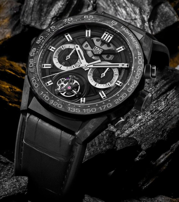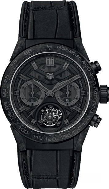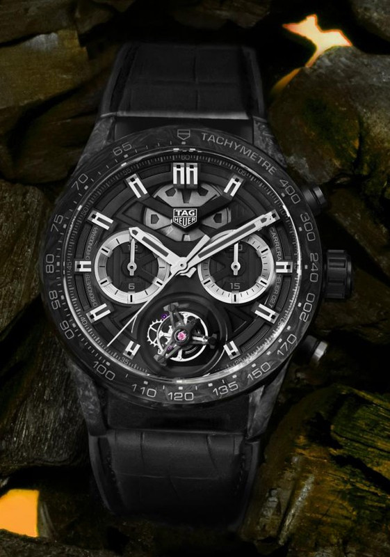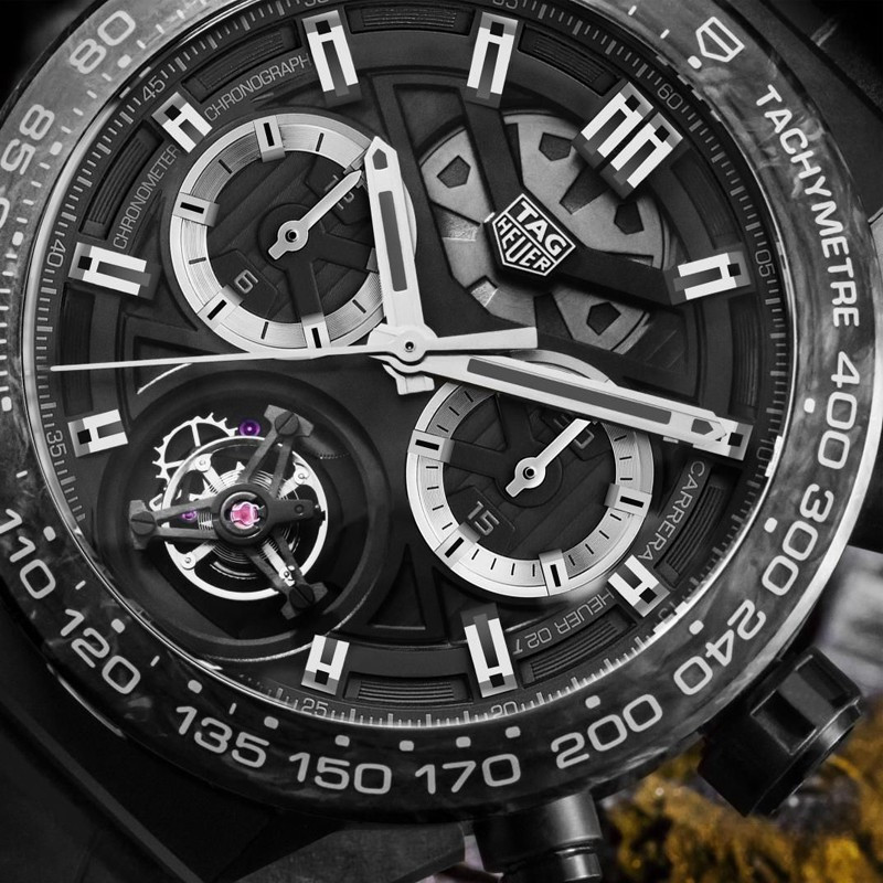 Tag Heuer Carrera Heuer-02Т Tourbillon имеет модульную конструкцию корпуса диаметром 45 мм, позволяющую легко создавать новые стили. Центральная часть, выступы с независимыми центральными вставками, выделяющийся безель – корпус состоит из 12 модульных компонентов. TAG Heuer Carrera Heuer-02Т Tourbillon имеют полу-скелетонизированный циферблат, который на самом деле прозрачный и имеет сапфировое стекло со шкалами для субциферблатов и индексами, демонстрируя скелетонизированные мосты и палеты часового механизма. Барабан с основной пружиной можно увидеть в позиции 12 часов, несколько колес видны сквозь субциферблаты. Основное внимание на циферблате привлекает турбийон возле 6 часов. TAG Heuer утверждают, что в основе часового механизма Carrera Heuer-02Т Tourbillon лежит Калибр СН-80, что означает наличие автоматического завода со встроенным механизмом хронографа, который работает с помощью колонного колеса. Часовой механизм обеспечивает значительные 65 часов запаса хода и сертифицирован COSC. Классический турбийон делает один оборот в минуту и работает с частотой 4 Гц. Он имеет балансовое колесо, пружину, спусковое колесо и палетную вилку – все, что находится в клети, которая вращается на центральной оси.