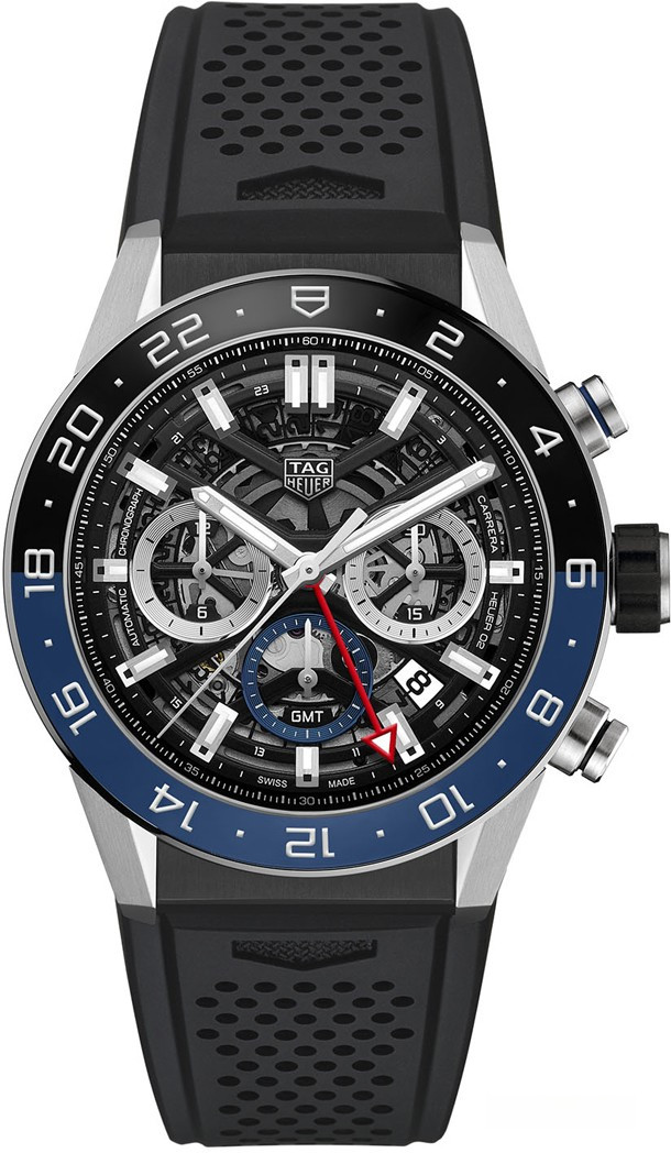Модель Carrera в этом году отмечает свое 55-летие. В честь этого события часовая мануфактура TAG Heuer представила новинку Carrera Heuer 02 GMT Chronograph. Это часы усложнены новой функцией, которая несомненно порадует любителей путешествий. Бестселлер Carrera обрел стрелку GMT и 24-часовой безель. Часы имеют классический стальной корпус и ушки. Размер часов составляет 45 мм в диаметре. Безель часов изготовлен из синей и черной керамики, на которой видна 24-часовая шкала. Время второго часового пояса легко настраивается с помощью коронки. Механизм с хронографом видно через скелетированный циферблат. Мануфактурный Калибр Heuer 02 обладает интегрированным хронографом с колонным колесом и вертикальной передачей. Запас хода механизма составляет 75 часов.
