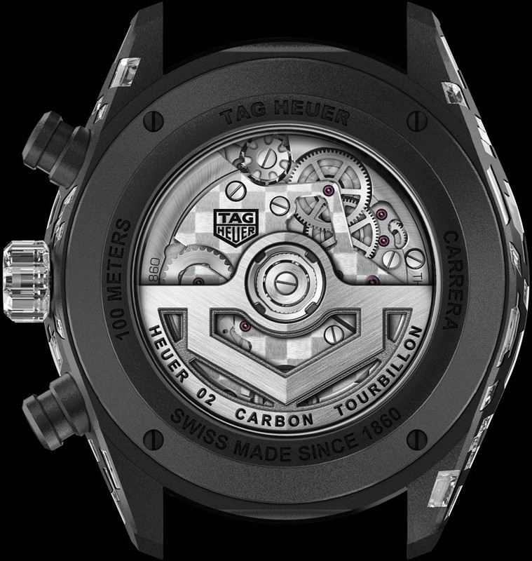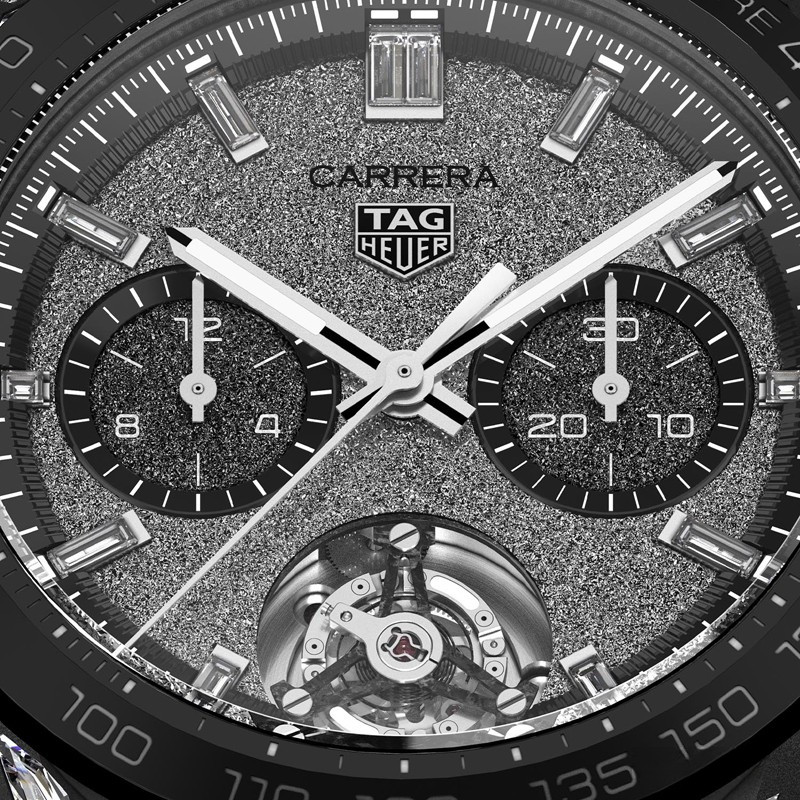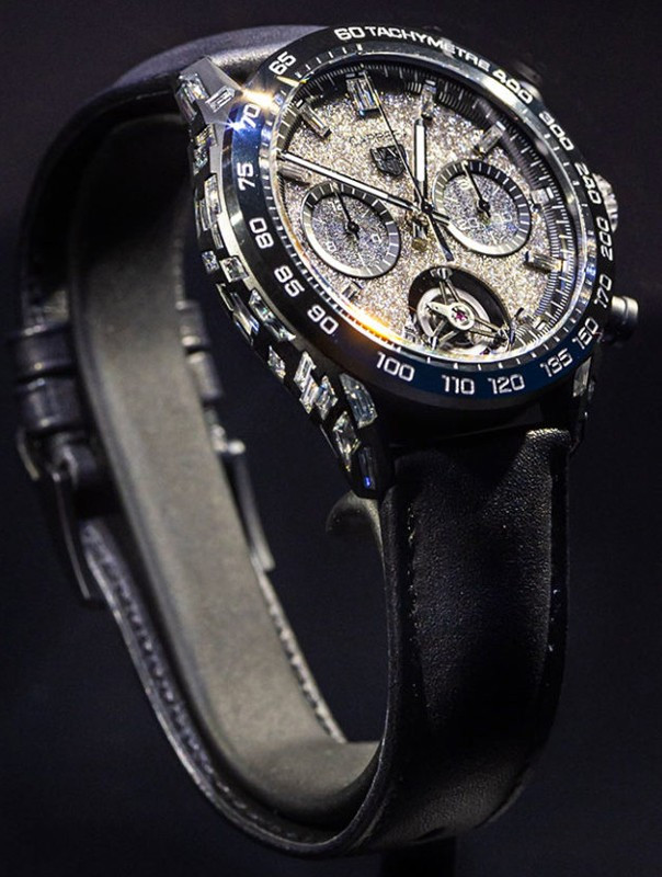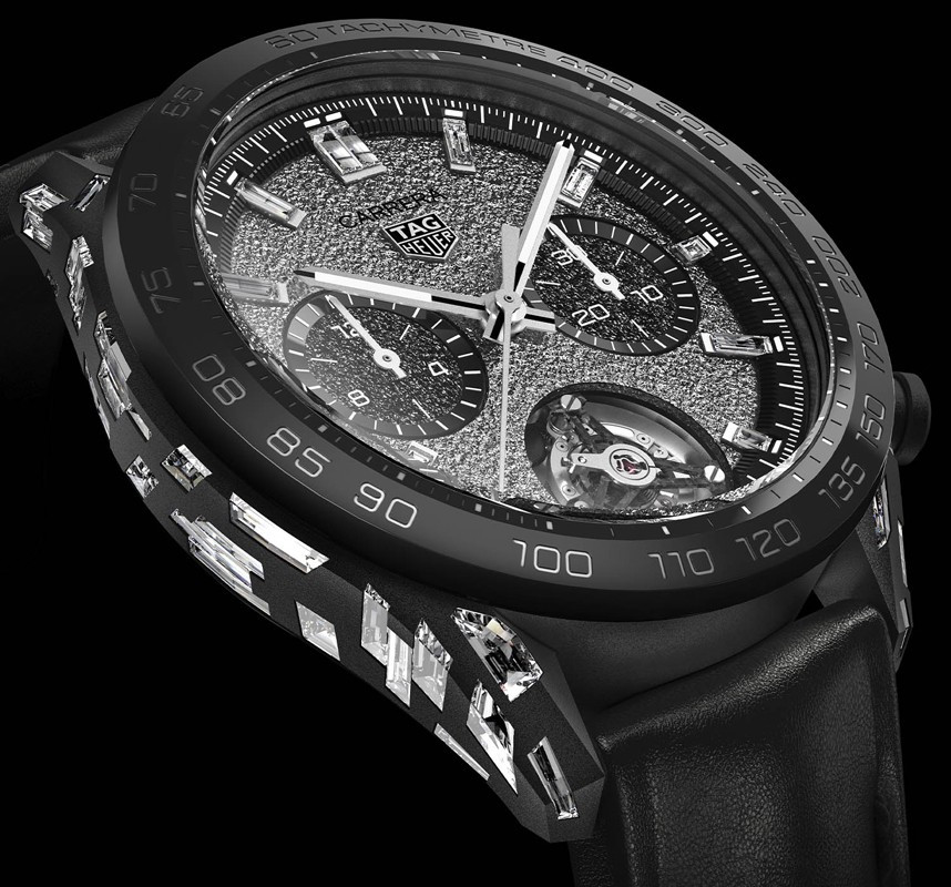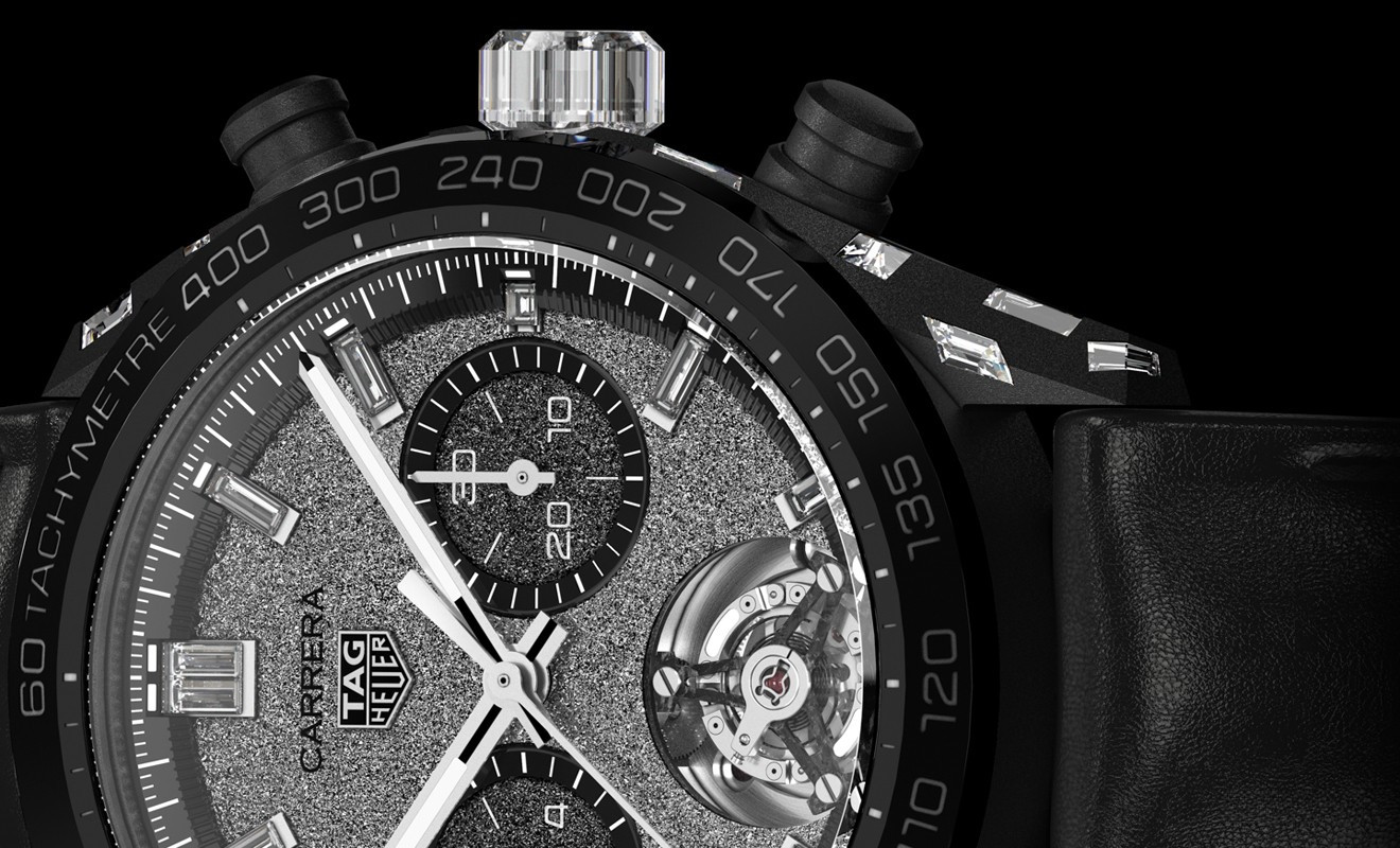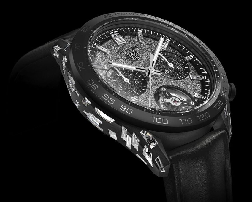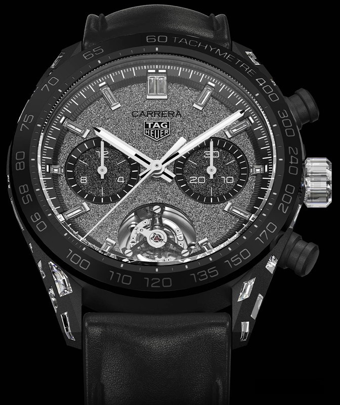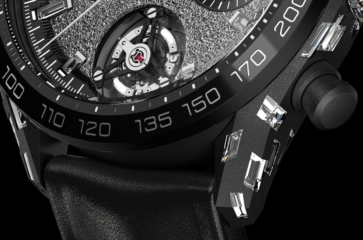 Часы TAG Heuer Carrera Plasma Tourbillon Nanograph представлены в корпусе из анодированного алюминия размером 44 мм водонепроницаемостью 50 метров. Внутри корпуса установлен автоматический механизм, Калибр Heuer 02T, обладающий запасом хода 65 часов. На сером циферблате с белыми бриллиантами отображаются часы, минуты, секунды, турбийон. Часы комплектуются кожаным ремешком с титановой застежкой. Корпус инкрустирован белыми бриллиантами.