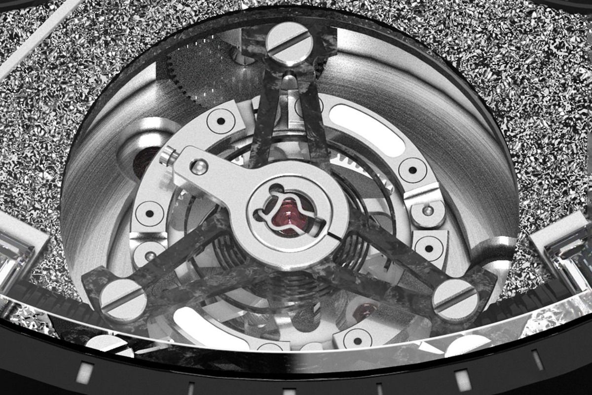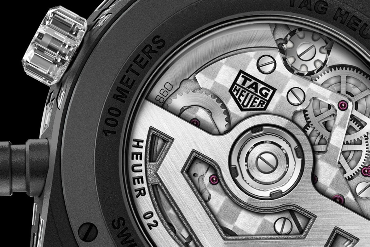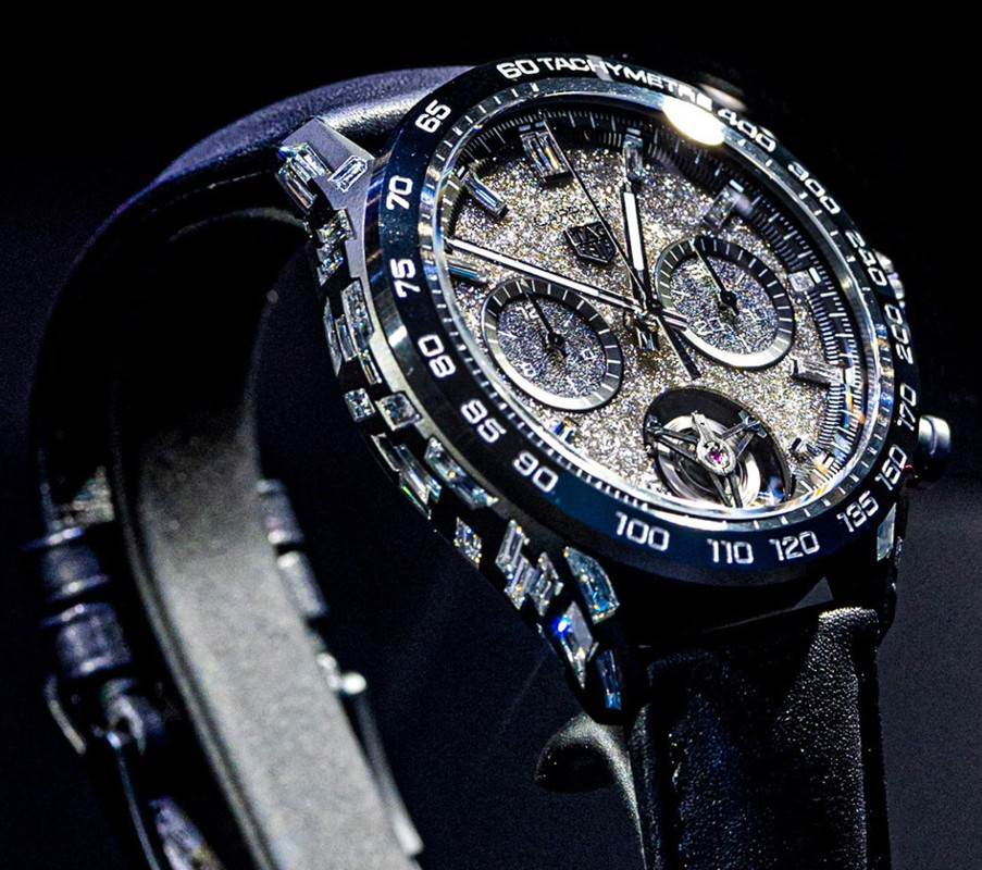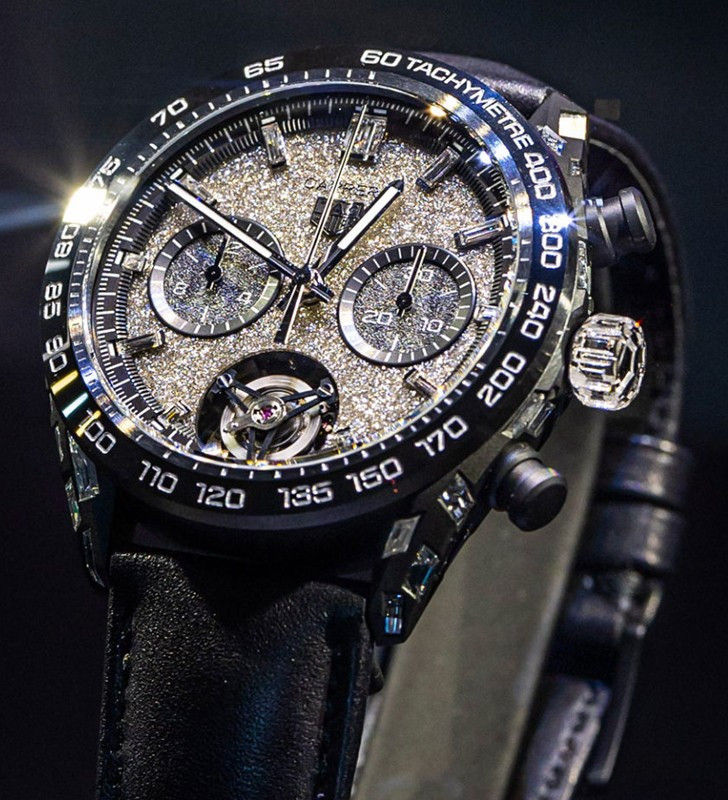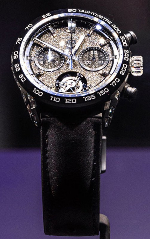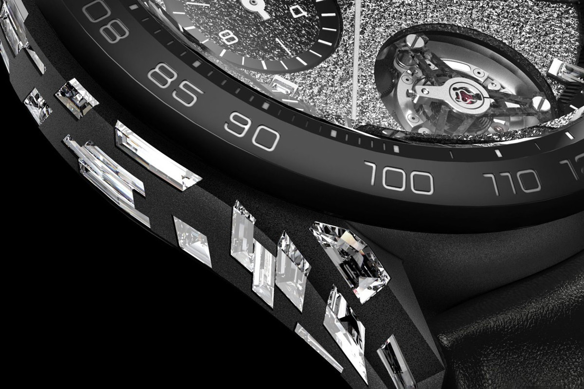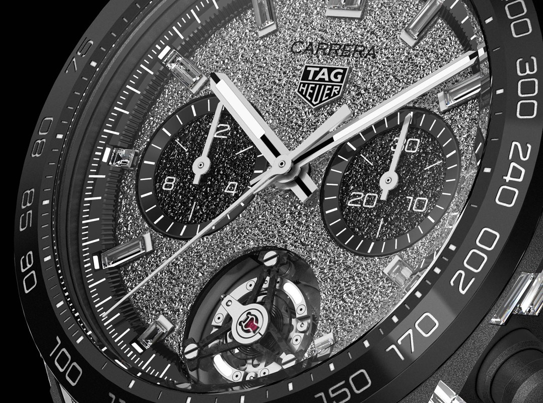 Часы TAG Heuer Carrera Plasma Tourbillon Nanograph представлены в корпусе из анодированного алюминия размером 44 мм водонепроницаемостью 50 метров. Внутри корпуса установлен автоматический механизм, Калибр Heuer 02T, обладающий запасом хода 65 часов. На сером циферблате с белыми бриллиантами отображаются часы, минуты, секунды, турбийон. Часы комплектуются кожаным ремешком с титановой застежкой. Корпус инкрустирован белыми бриллиантами.