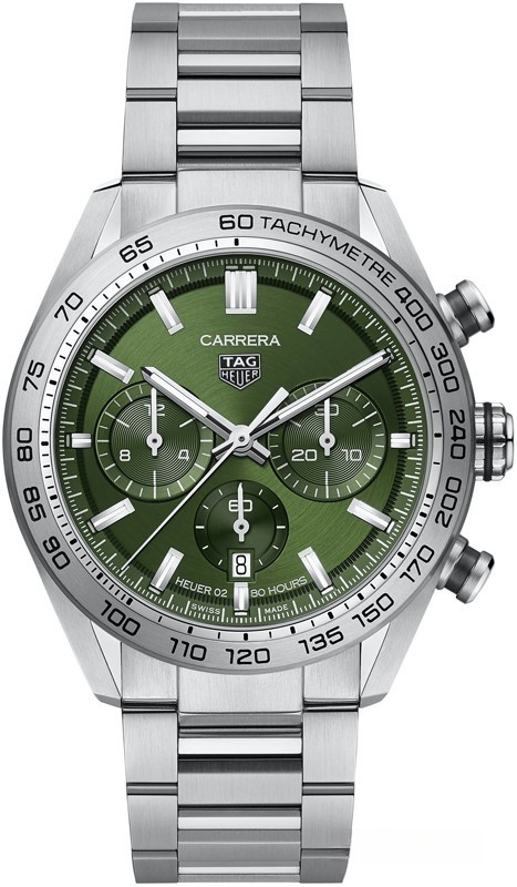 Часы TAG Heuer Carrera Sport Chronograph 44mm Calibre Heuer 02 Automatic изготовлены из нержавеющей стали, на стальном браслете. Размер корпуса 44 х 15.27 мм. Сапфировое стекло с антибликовым покрытием. Циферблат зеленый. На циферблате отображаются часы, минуты, секунды, дата, шкала тахиметра, накопители хронографа. Водонепроницаемость составляет 100 метров. Внутри корпуса установлен автоматический механизм, Калибр Heuer 02 с запасом хода 80 часов.