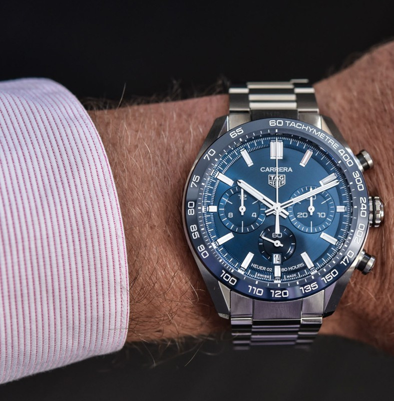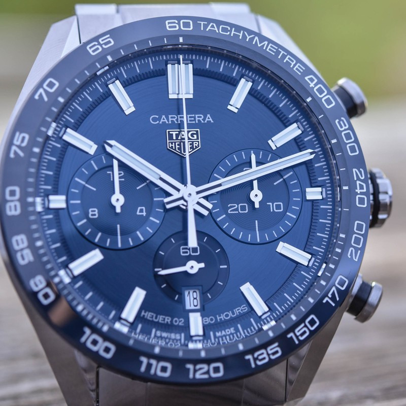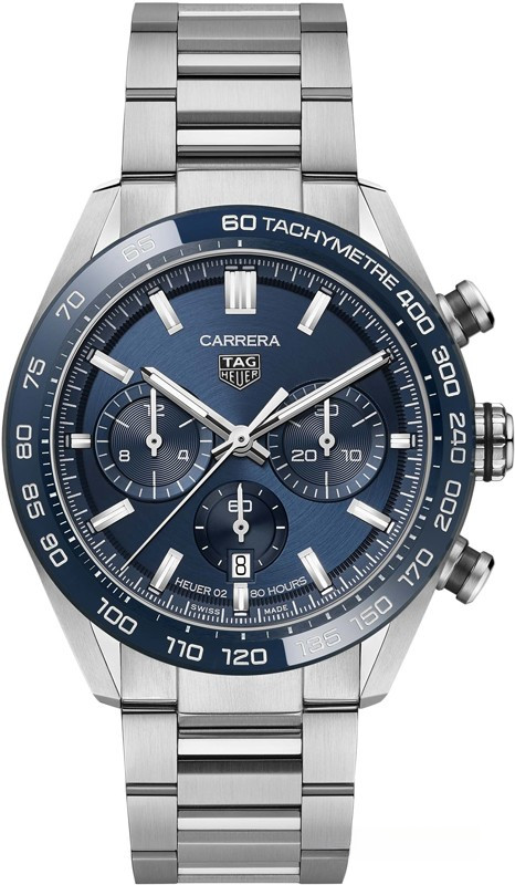 Часы TAG Heuer Carrera Sport Chronograph 44mm Calibre Heuer 02 Automatic изготовлены из нержавеющей стали, на стальном браслете. Размер корпуса 44 х 15.27 мм. Сапфировое стекло с антибликовым покрытием. Циферблат синий. На циферблате отображаются часы, минуты, секунды, дата, шкала тахиметра, накопители хронографа. Водонепроницаемость составляет 100 метров. Внутри корпуса установлен автоматический механизм, Калибр Heuer 02 с запасом хода 80 часов.