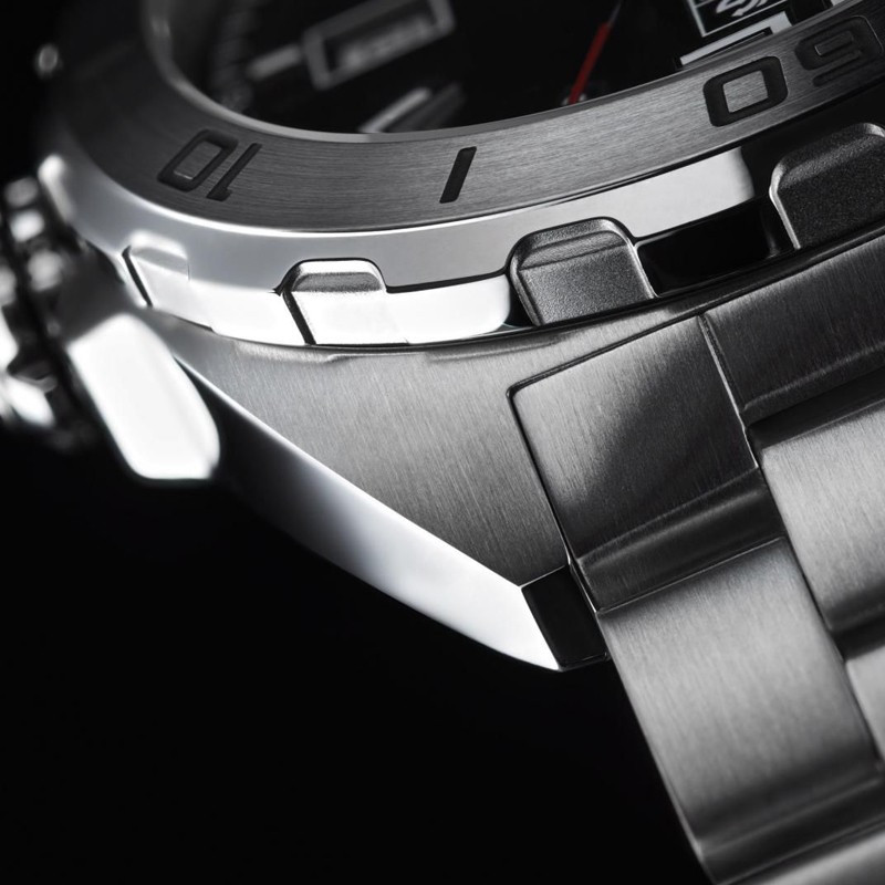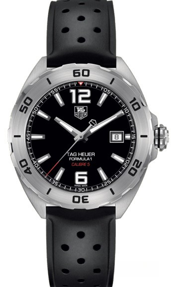 Часы TAG Heuer Formula 1 Calibre 5 представлены в корпусе из нержавеющей стали размером 41 мм водонепроницаемостью 200 метров. Внутри корпуса установлен автоматический механизм, Калибр 5, обладающий запасом хода 38 часов. На черном циферблате отображаются часы, минуты, секунды, дата. Часы поставляются на каучуковом ремешке с вставкой из нержавеющей стали.