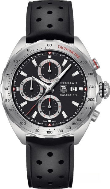Часы TAG Heuer Formula 1 Calibre 1 представлены в корпусе из нержавеющей стали размером 44 мм водонепроницаемостью 200 метров. Внутри корпуса установлен автоматический механизм с функцией хронографа, Калибр 16. На черном циферблате отображаются часы, минуты, секунды, дата, тахиметр, накопители хронографа. Часы поставляются на каучуковом ремешке с вставкой из нержавеющей стали.