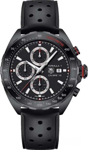 Часы TAG Heuer Formula 1 Calibre 1 представлены в корпусе из нержавеющей стали с покрытием PVD размером 44 мм водонепроницаемостью 200 метров. Внутри корпуса установлен автоматический механизм с функцией хронографа, Калибр 16. На черном циферблате отображаются часы, минуты, секунды, дата, тахиметр, накопители хронографа. Часы поставляются на каучуковом ремешке с вставкой из нержавеющей стали.