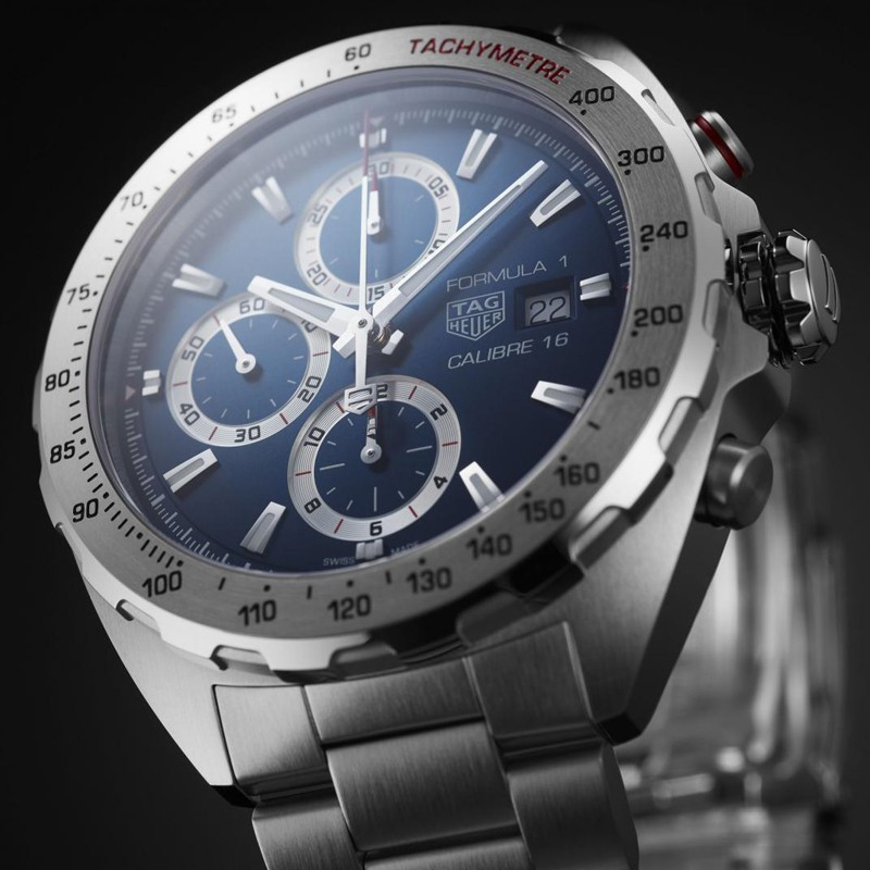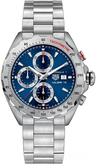 Часы TAG Heuer Formula 1 Calibre 1 представлены в корпусе из нержавеющей стали размером 44 мм водонепроницаемостью 200 метров. Внутри корпуса установлен автоматический механизм с функцией хронографа, Калибр 16. На синем циферблате отображаются часы, минуты, секунды, дата, тахиметр, накопители хронографа. Часы поставляются на браслете из нержавеющей стали.