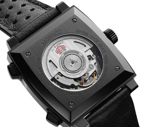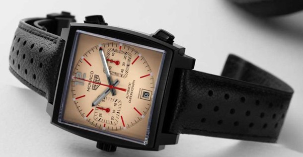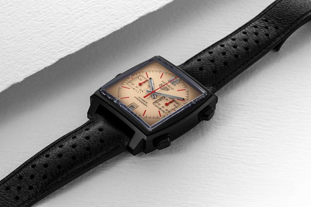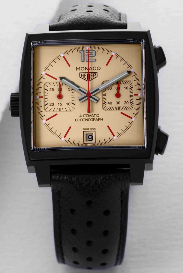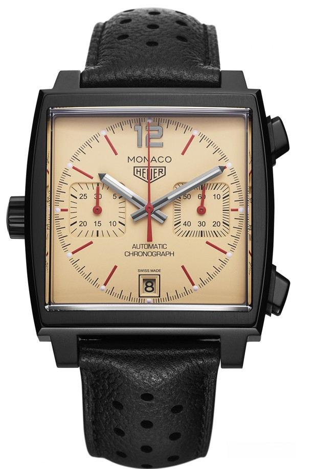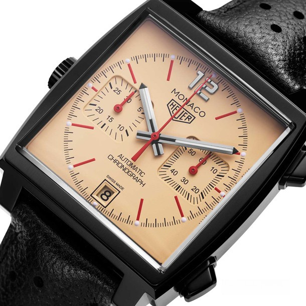 TAG Heuer Monaco Caliber 11 The Hour Glass – часы в стиле ретро со спортивным характером. Модель комплектуется уникальным бежевым циферблатом с красными, белыми и черными акцентами. Новинка поставляется с перфорированным черным ремешком из телячьей кожи. Циферблат дополняет черный стальной корпус с покрытием PVD шириной 39 мм. Задняя крышка корпуса из сапфира открывает вид на Калибр 11. Водонепроницаемость корпуса составляет 100 метров. На циферблате расположены два накопителя хронографа на 3-х и 9-ти часах, апертура даты на 6-ти часах, красные индексы отмечены белым SuperLuminova. Часовая и минутная стрелки черного цвета, покрыты белым SuperLuminova, а центральная стрелка - красная. Черный винтажный логотип Heuer расположен на 12-ти часах. Новинка выпущена ограниченной серией 50 штук.