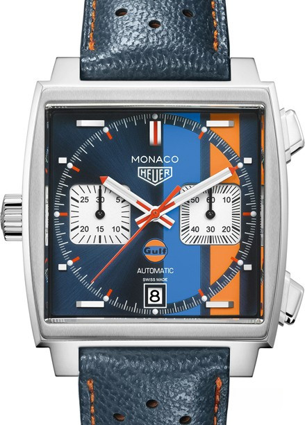 Часы TAG Heuer Monaco Gulf Special Edition представлены в квадратном корпусе из нержавеющей стали размером 39 х 39 мм и водонепроницаемостью 100 метров. Внутри корпуса установлен автоматический механизм, Калибр TAG Heuer 11 с запасом хода 40 часов. На синем циферблате отображаются часы, минуты, секунды, дата, накопители хронографа. Часы комплектуются ремешком из кожи теленка с вставкой из нержавеющей стали.