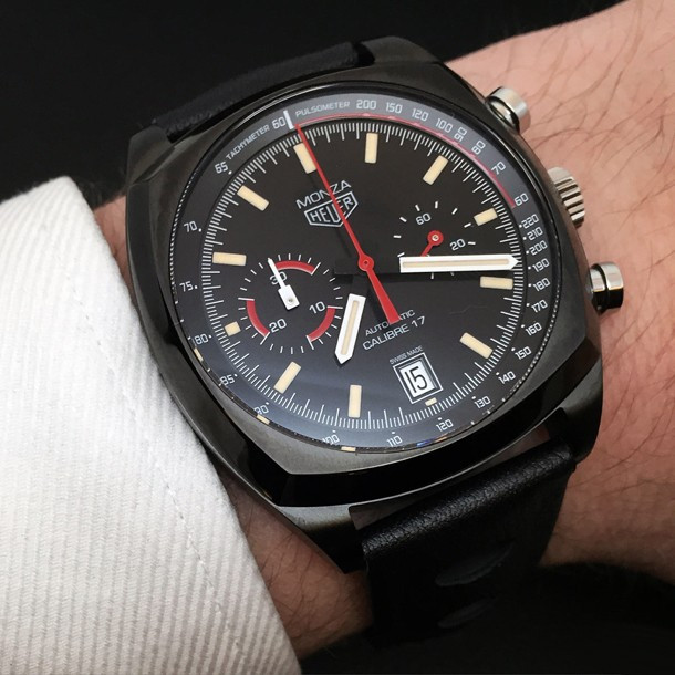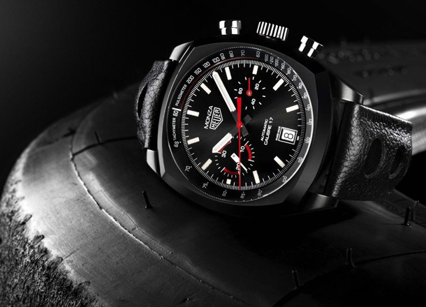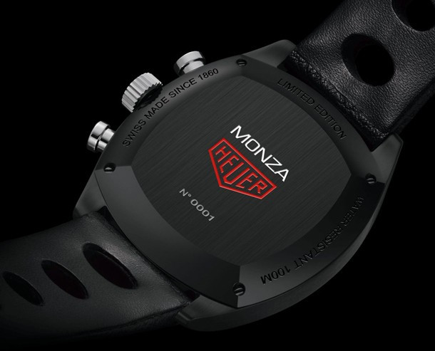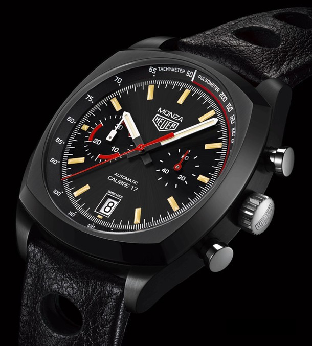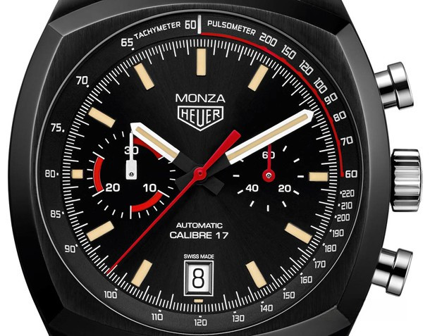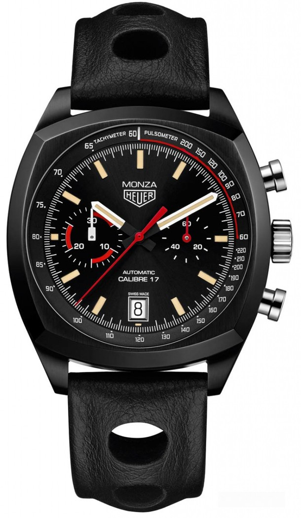 Часовая мануфактура Tag Heuer представила новую модель часов Heuer Monza 40th Anniversary (Ref. CR2080.FC6375). Корпус новинки подушкообразной формы, изготовлен из титана, покрытого карбидом титана черного цвета. Диаметр корпуса составляет 42 мм, а водонепроницаемость до 100 метров. Завинчивающаяся рифленая заводная головка, изготовленная из нержавеющей стали, расположена на 3 часах, а стальные пушеры хронографа - на 2 и 4 часах. Задняя крышка часового корпуса глухая, на четырех винтах; на ней имеется исторический логотип Heuer, такой же, как и на циферблате. Сапфировое стекло с антибликовым покрытием защищает черный циферблат. На фланце размещены шкала тахиметра и пульсомера. Модель оснащена автоматическим механизмом TAG Heuer 17, с балансовой частотой 28800 полуколебаний в час (4 гц), 42-часовым запасом хода, функциями индикации часов, минут, секунд, даты, а также с хронографом (центральная секундная стрелка красного цвета и круглый аналоговый 30-минутный счетчик, расположенный на 9 часах). Часы поставляются на черном кожаном перфорированном ремешке.