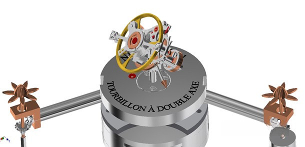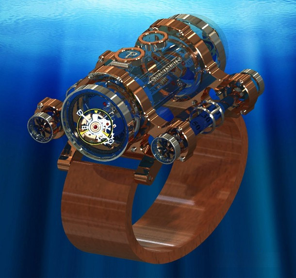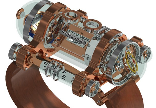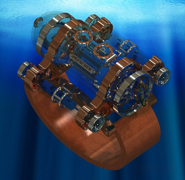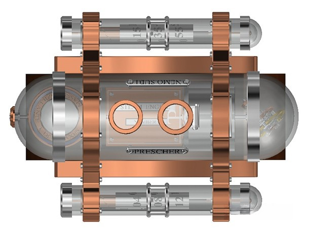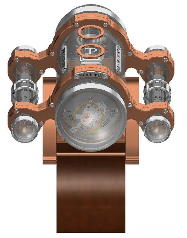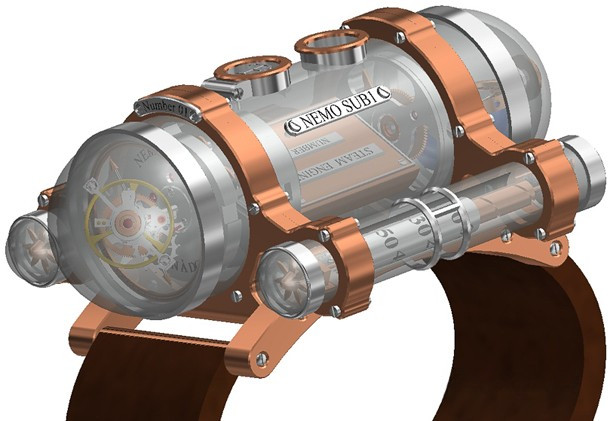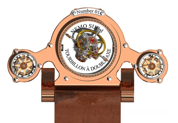 Thomas Prescher Nemo Sub I – би-осевый турбийон с автоматическим механизмом и тройным корпусом из сапфирового стекла, розового золота 18к и палладия. Корпус разделен на 3 части: главный цилиндр и 2 боковых. Функции: часы в правой боковой трубке – спиральный стержень поворачивается 3 раза в течение 12 часов, прежде чем прыгнуть в исходное положение; спиральный стержень минут в левой боковой трубке поворачивается 3 раза в течение 12 часов, затем прыгает в исходное положение; секунды – двойная стрелка из красного золота на второй оси турбийона. Винты никакой функциональной нагрузки не несут. Верхний люк открывает коронку установки и завода. Частота колебаний 21000 пк/ч, запас хода 40 ч. Механизм разработан в вертикальном положении. Серия ограничена 5 экземплярами. Ремешок ручной работы из черной кожи аллигатора с вставкой из розового золота 18к.