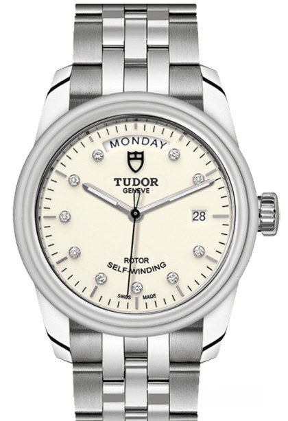 Часы Tudor Glamour Date Day представлены в корпусе из нержавеющей стали размером 39 мм. Внутри корпуса установлен автоматический механизм, Калибр 2834, обладающий запасом хода 38 часов. На белом циферблате с 10-ю белыми бриллиантами отображаются часы, минуты, секунды, дата и день недели. Часы поставляются на браслете из нержавеющей стали. Водонепроницаемость корпуса составляет 100 метров.